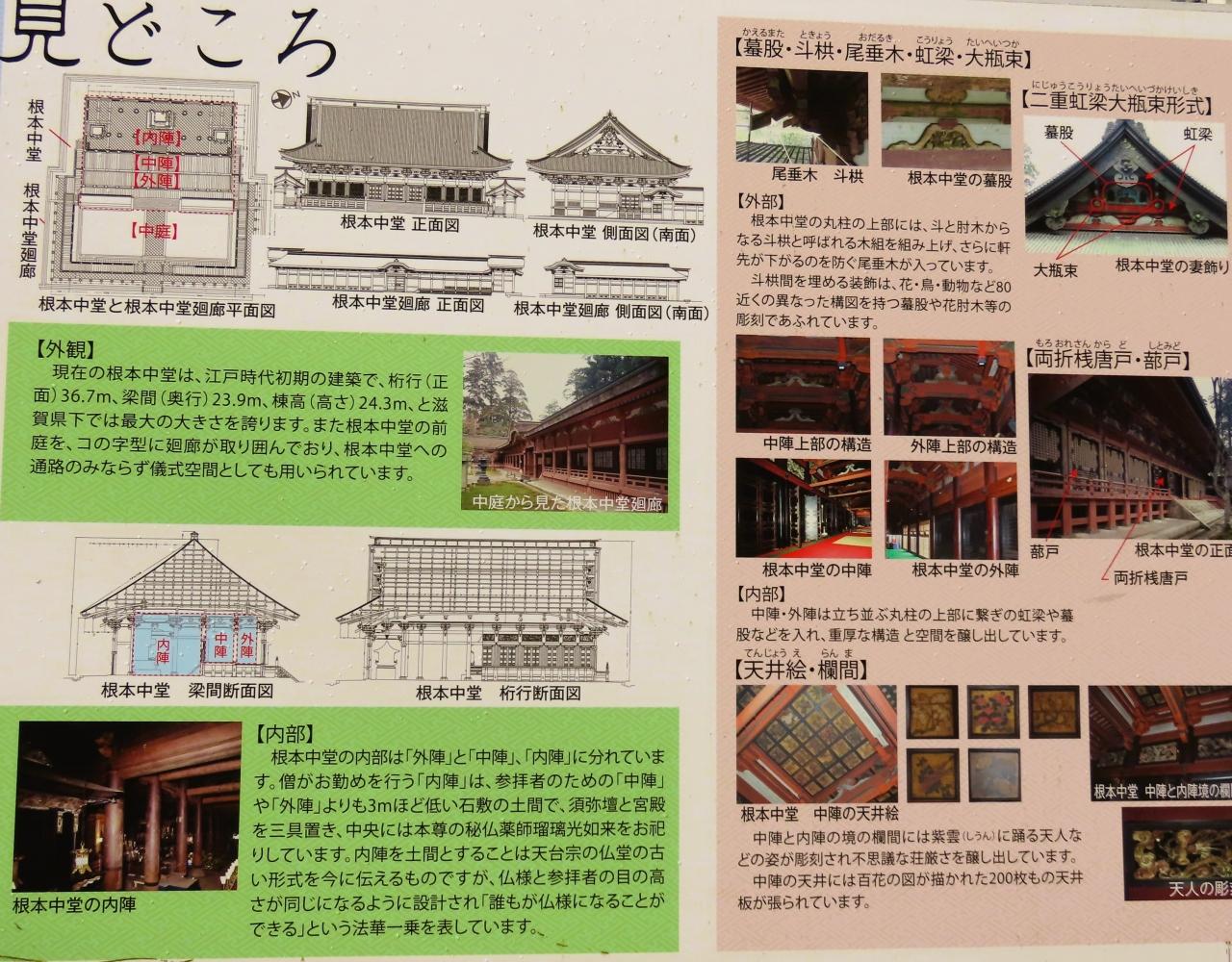 根本中堂(国宝) -最澄によって延暦7年(788年)に建立された一乗止観院の後身で、延暦寺の総本堂。延暦寺五大堂の一つ。現在の建物は織田信長による比叡山焼き討ちの後、寛永19年(1642年)に徳川家光によって再建されたもの。1953年(昭和28年)に国宝に指定されている。