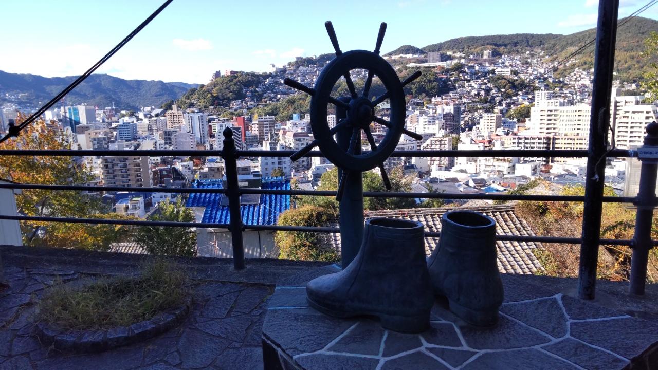 大きな亀の背中に乗った万国霊廟長崎観音様が長崎の街を