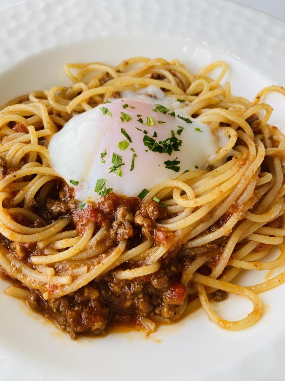 私が選んだのは「長野県産鹿肉のボロネーゼ 温泉卵と共に」。