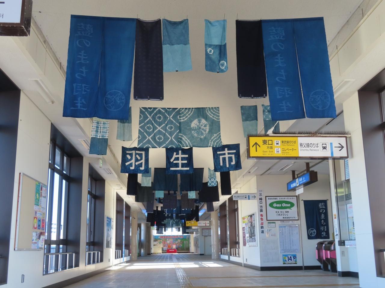 駅のコンコース。藍染めのPRでしょうか。そう言えば、渋沢栄一の生家も藍を扱う商いをしてましたね。