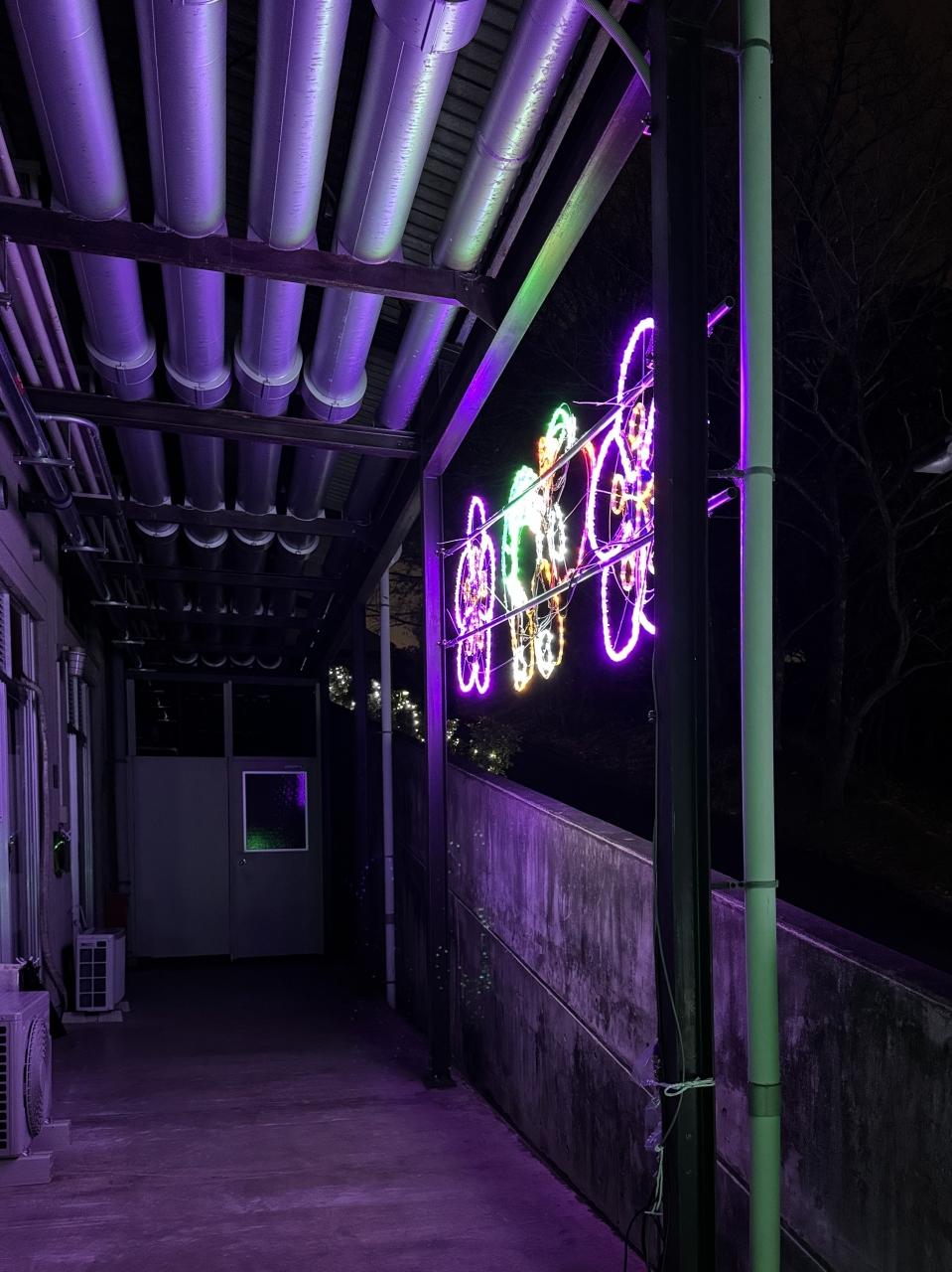 パソコンルームから建物沿いに歩き、坂を下って行く。この通路はバス通学時に利用されるもので、高槻市営バス平安女学院大学バス停に続いている。アーチ型の通路にイルミネーションが飾られているのは、イルミネーションの〝定番〟ではあるが、小規模イベントの場合は会場にそのような建造物がないために見ることができない。しかしその辺りはさすがに私立大学という印象を受ける。ただ肝心のバス停との境目には門扉が設けられており、出入りすることができなかった。バス停付近からは通路やパソコンルームに取り付けられた電飾が見えるのだが、通路からは見えないために後ほど場所を移動して立ち寄ることにした。