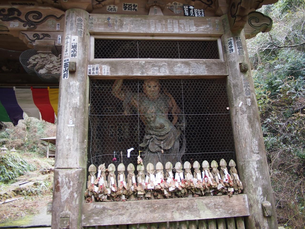 駐車場にクルマを停めてしばらくするとさっそくこの山門につくので、あら近いとおもってしまいますが、実はここから急な山道を1kmほど歩きます。この山門にその山道を登るための杖が貸し出されていまして。その必要性はすぐわかります。