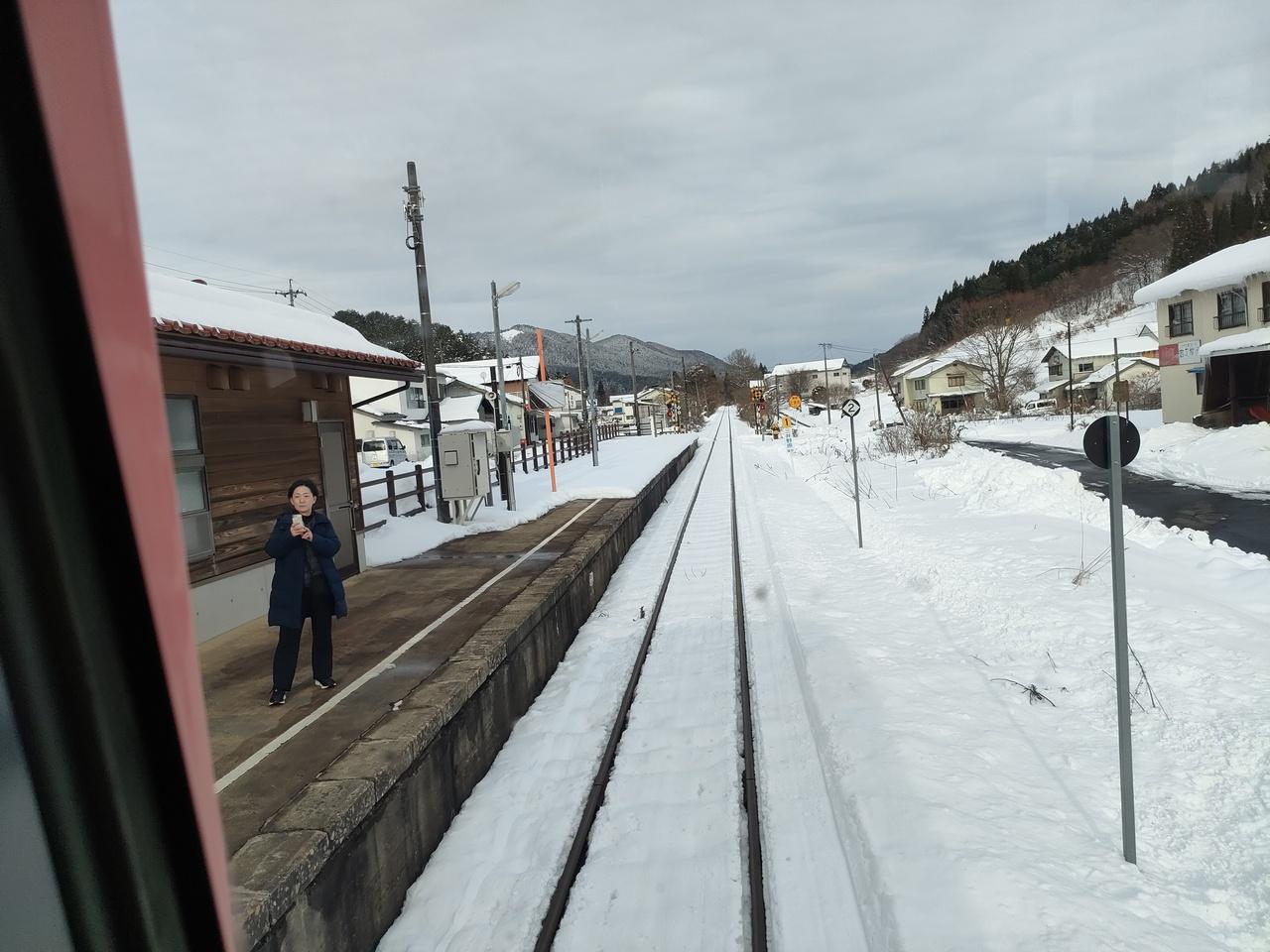 芸備線を中国山地の山側に進むにつれて、積雪量も増えて来ました。前方に見えるのが、ランキング30位の道後山駅です。