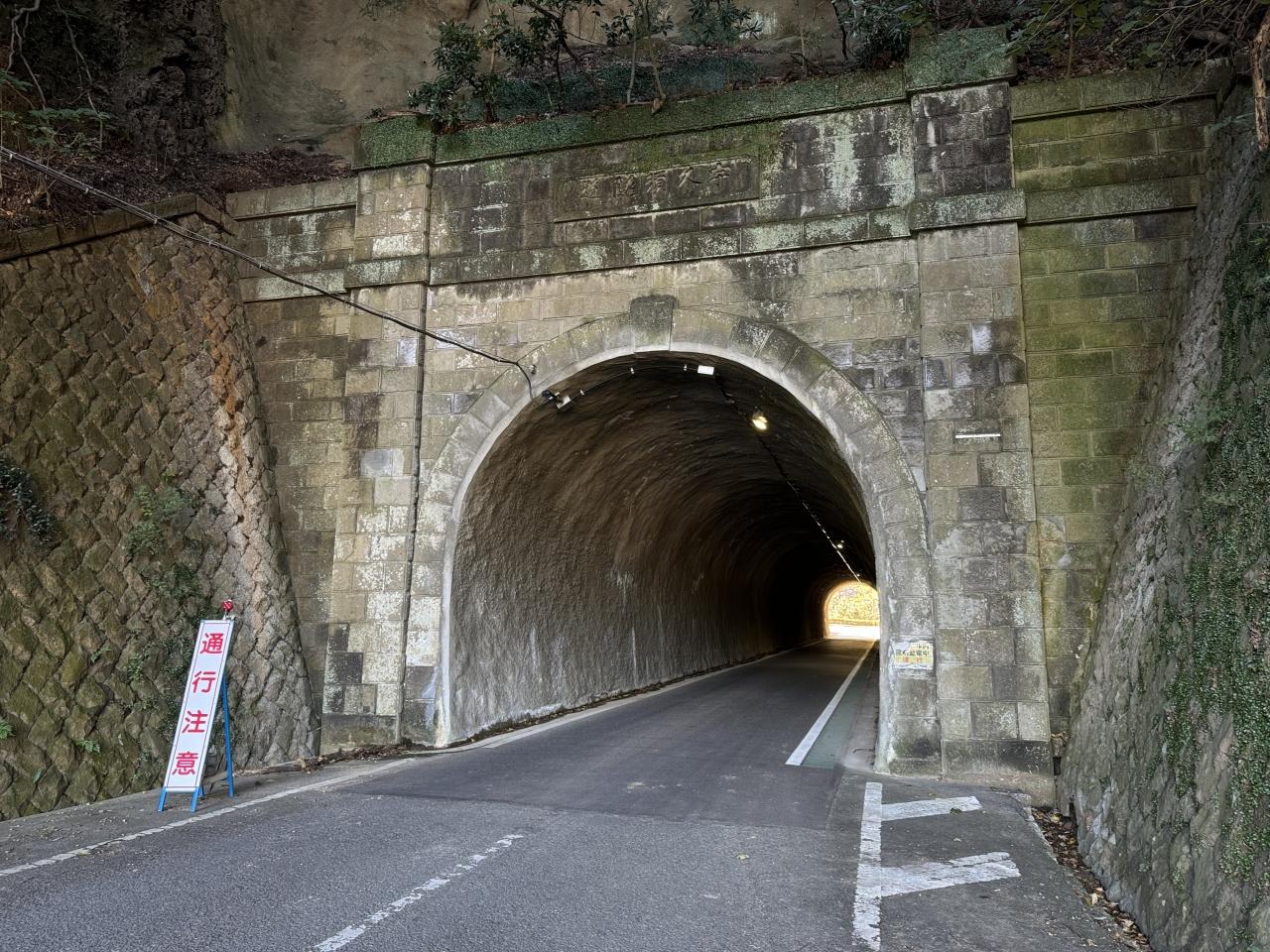 調べるとバスの時間まであと僅か。慌てて乗り場に向かい、路線バスで黄金崎へ。海へ向かう道を歩いていると、観光地には珍しく随分古そうなトンネルが… -