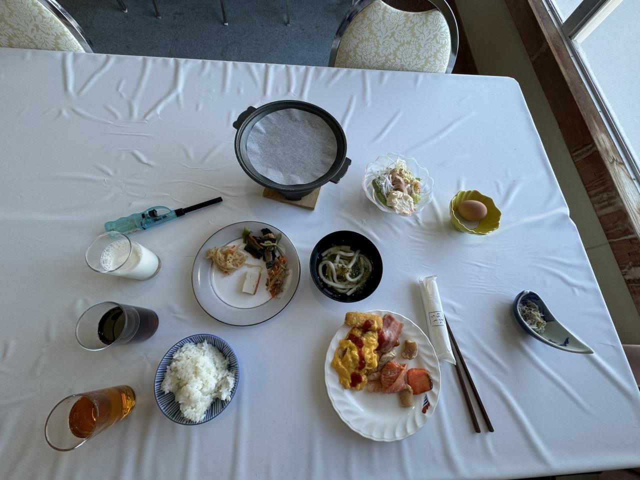 セルフの目玉焼きはテーブル上の固形燃料を使い、自分で作ります。エネルギーをしっかり蓄えたところで、さて出発です~
