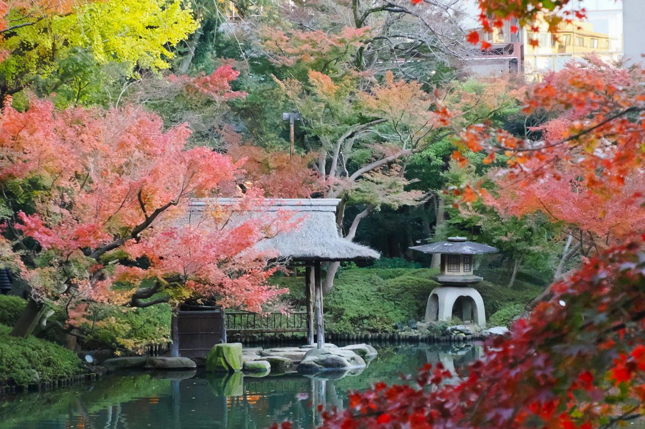 庭園が真っ赤に染まり 池にも赤い木々が映し出されます