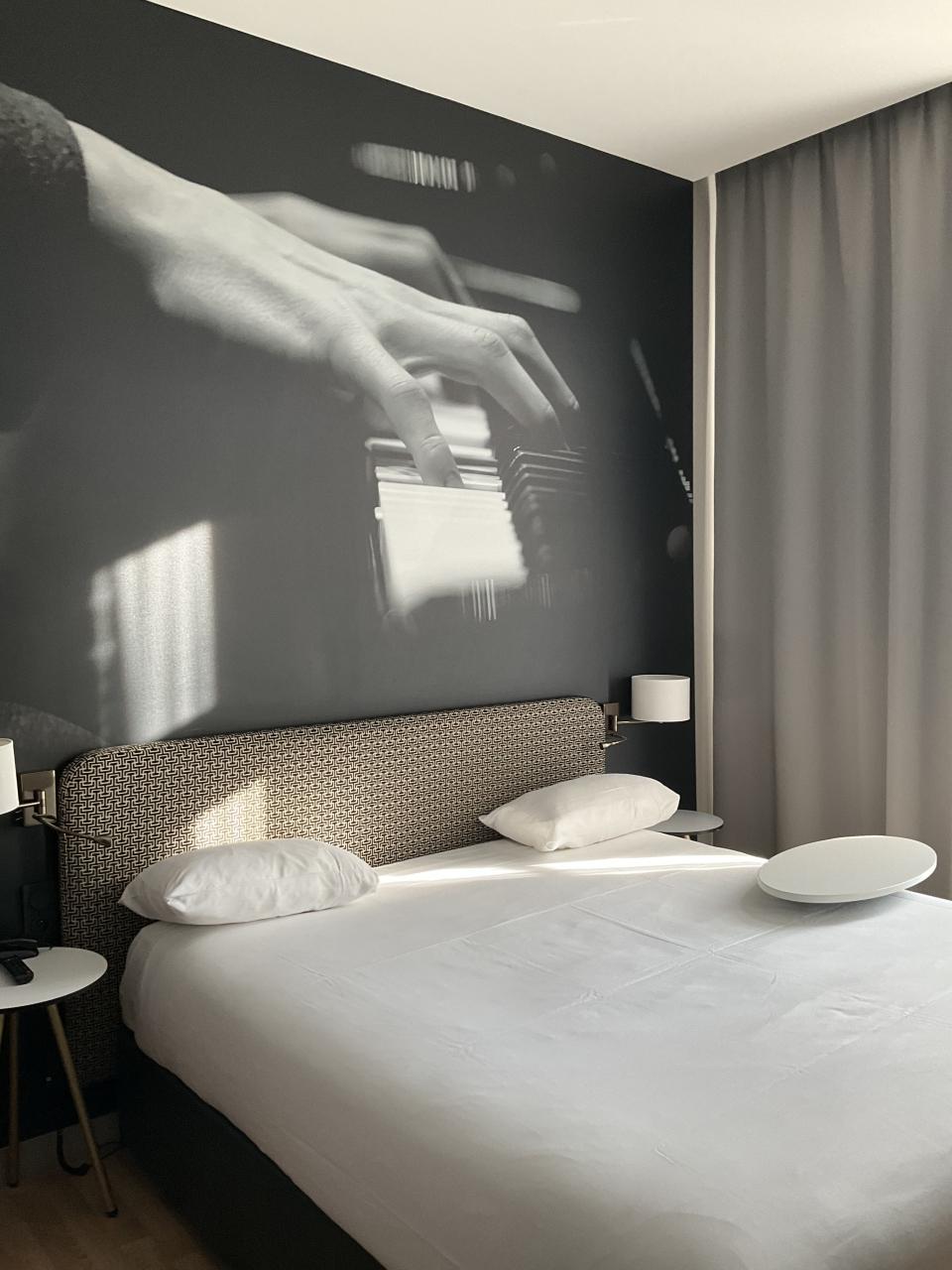 このホテルではアクセントクロスに楽器演奏の写真が使われている。部屋によって楽器の種類が異なるが、この部屋はピアノだった。