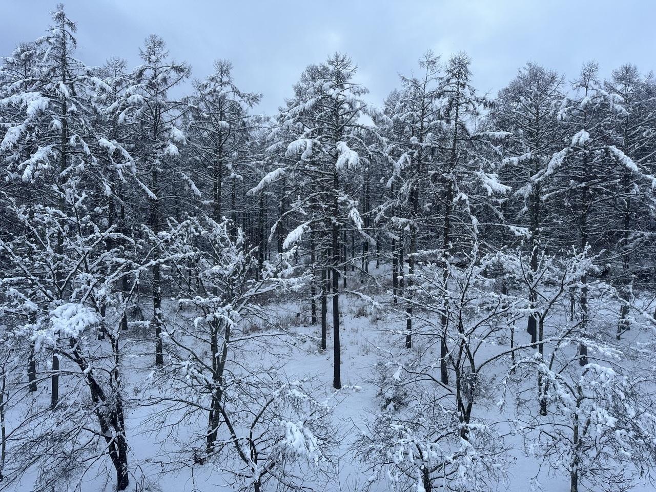 部屋の窓から見える森も雪景色。