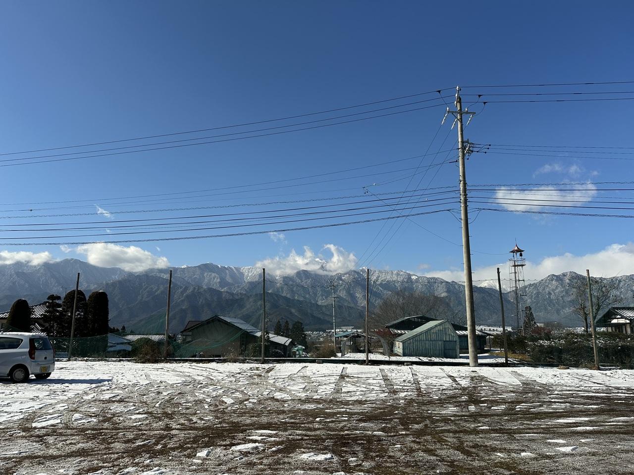 駐車場になっていた公民館から北アルプスの山がまぶしい。