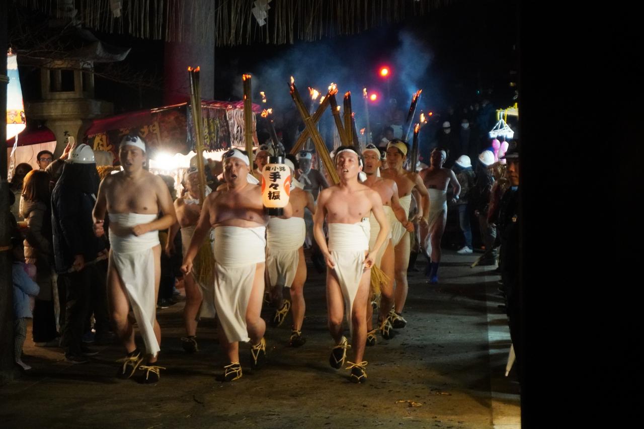 大松明に次ぐ見どころは、汐井汲みからシオイカキ。汐井汲みを終え、小松明を手にした男衆の大集団が境内を駆け抜けるのですが、後から後から大集団がやってきて、この段階で辺りは既に派手な火祭りの様相。熱気ムンムンで大松明の本番に向けた一団の気合を高めるシーンでもあると思います。また、大松明の点火後に、鬼堂前で行われる鉾面神事も意外に大事。祭神が妖族退治をした有様を示すものといわれ、本物の日本刀を振りかざし祭りの重要な場面とされています。