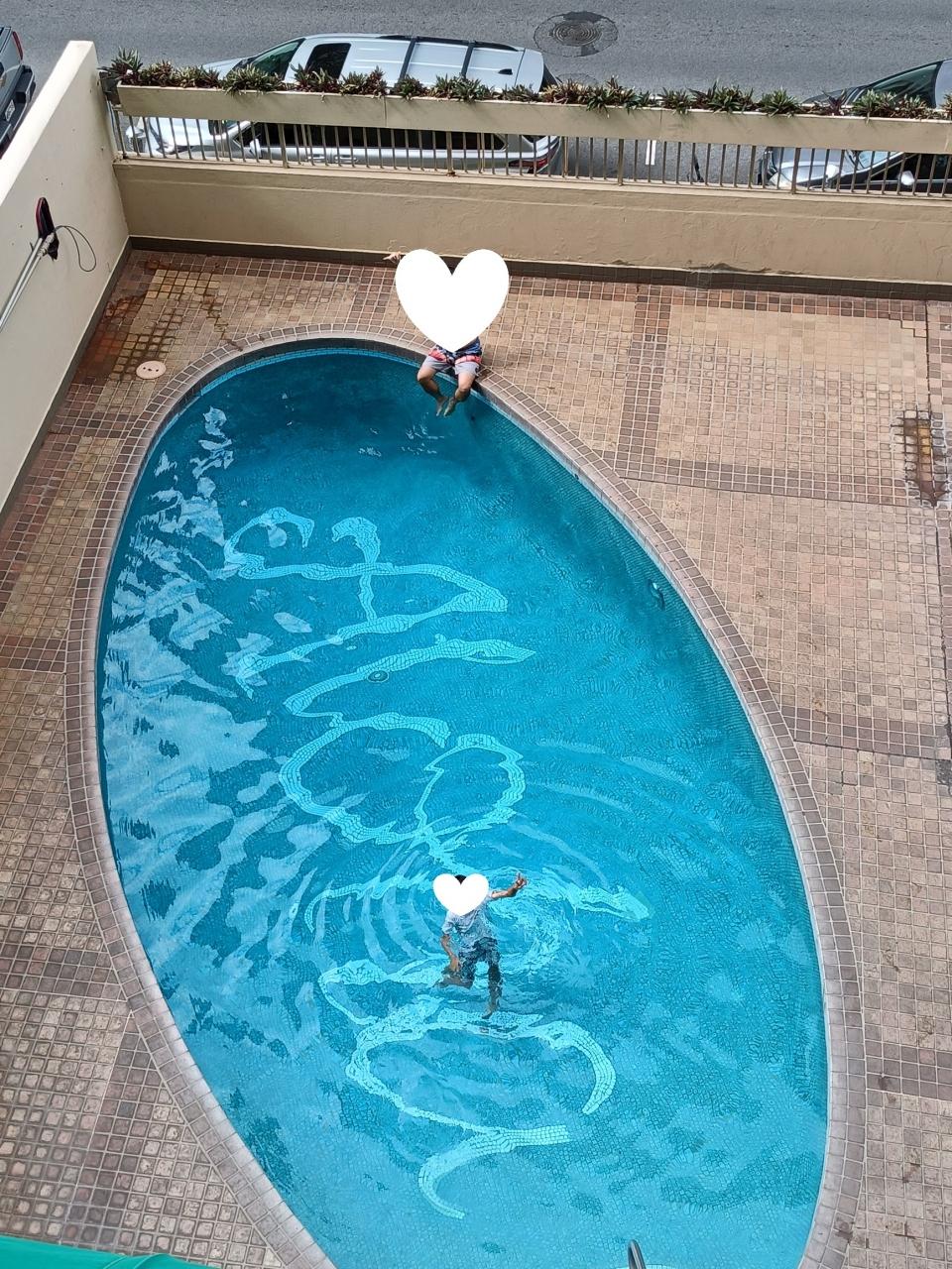 このプール、手前は浅いのですが奥側は深さ2mはある、海外規格。