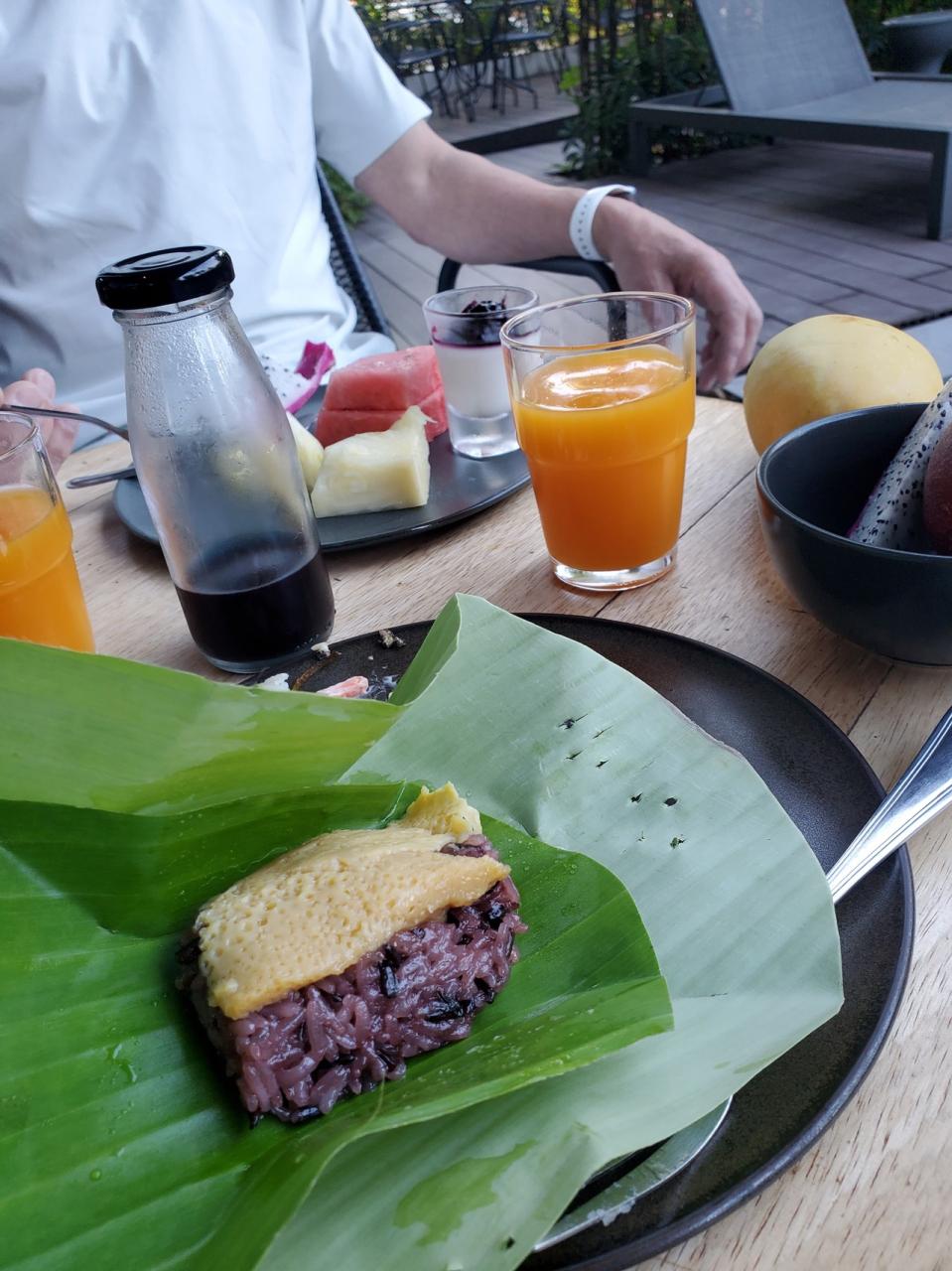 バナナの葉でくるまれて蒸された甘めの卵焼きに黒米の餅米