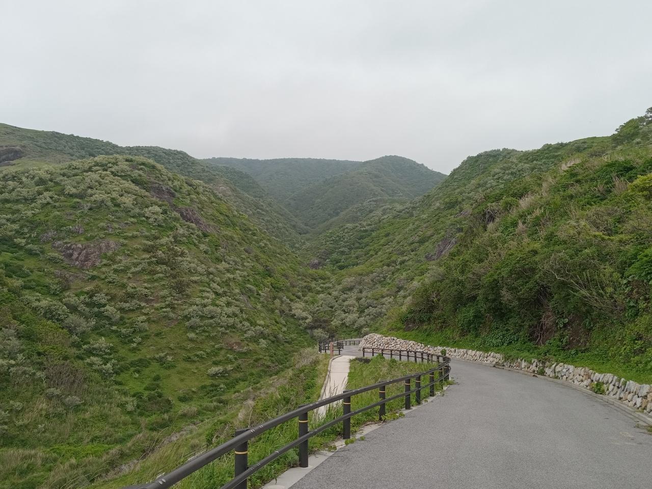 海岸から上がって駐車場に戻り、起伏の激しい海岸線のロードを走ります。