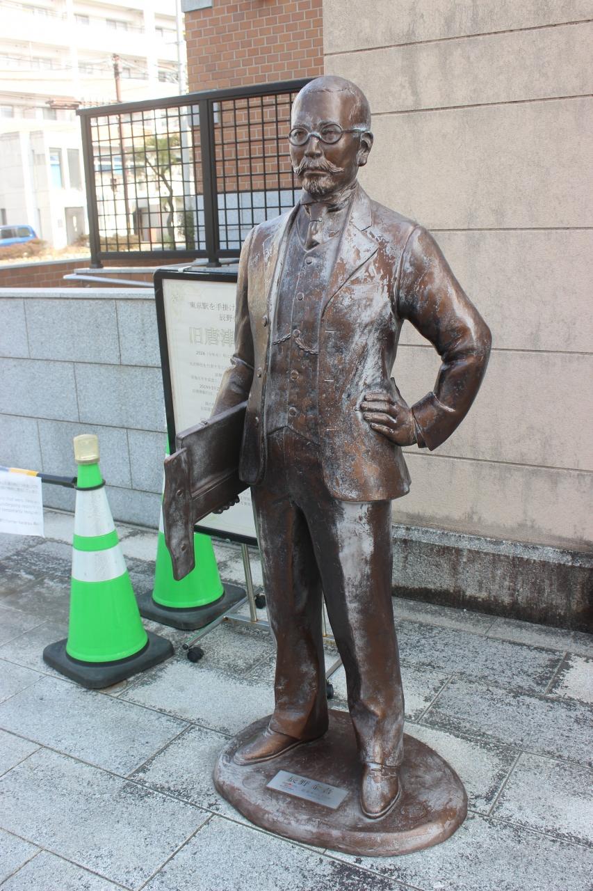 正面左の歩道には辰野金吾の銅像が立ちます。本来ならこの左に曽禰達蔵がベンチに座る像があるのですが、修理中とのことで展示されていませんでした。