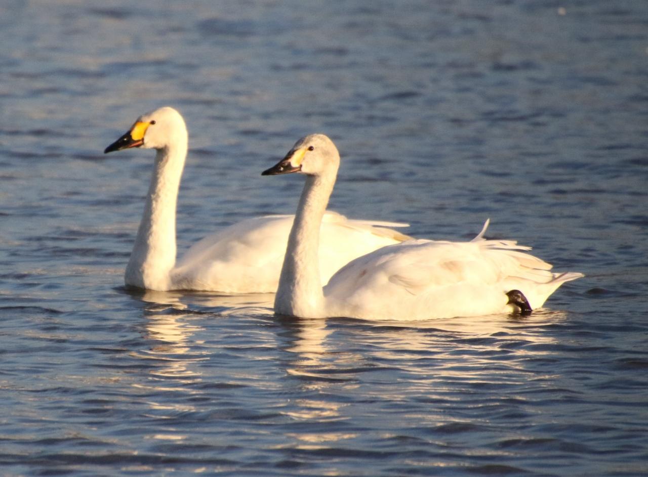 夕陽を浴びるコハクチョウ