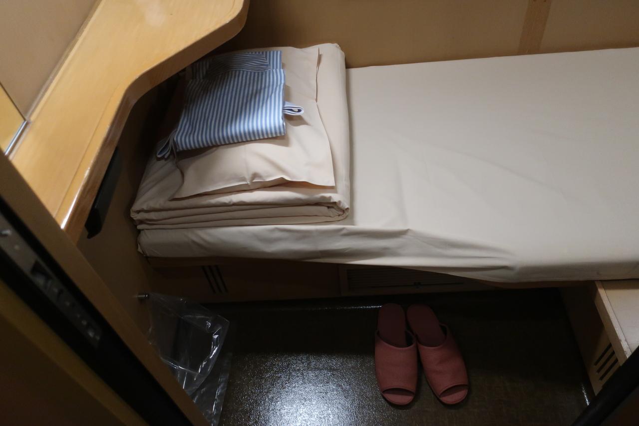 毛布と枕、寝巻とスリッパが備え付けられています。