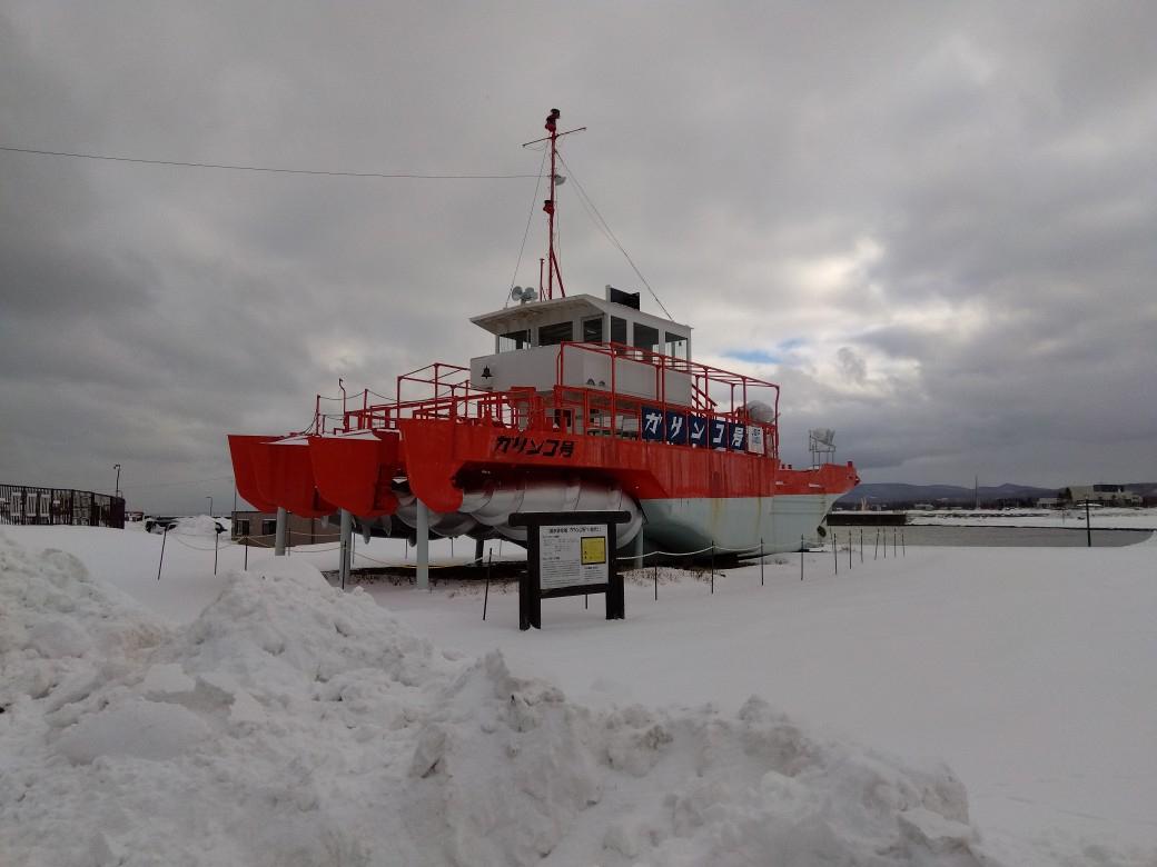 無料バスで降りて目的のところへ。途中、ガリンコ号1号が展示されていました。