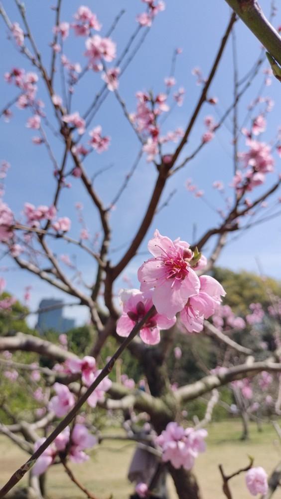 河津桜?のような濃いピンクの桜。ほぼ満開でした。