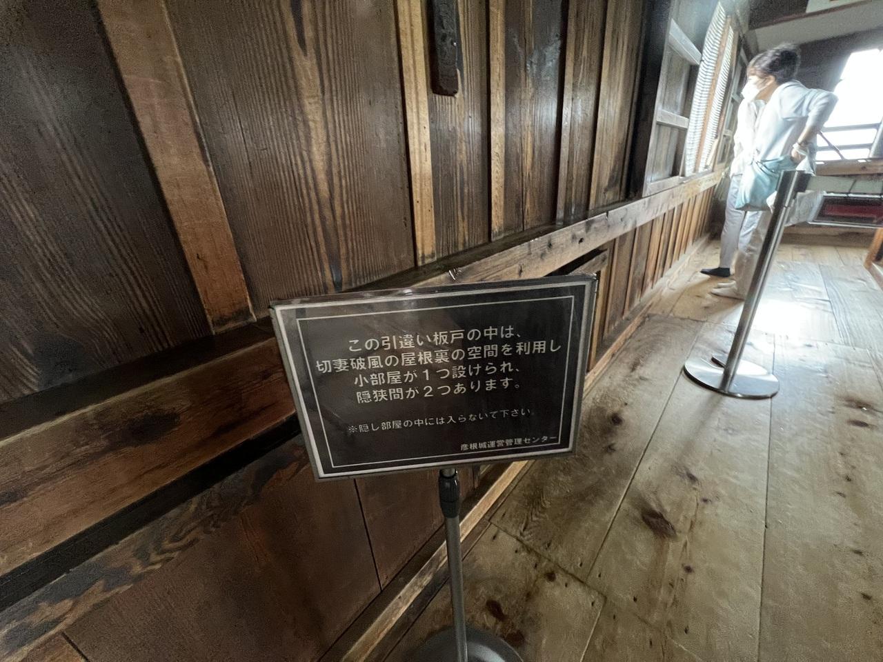 切妻破風の屋根裏の空間を利用し、引き違い戸の中に小部屋が一つ、隠狭間が二つあるそうです。