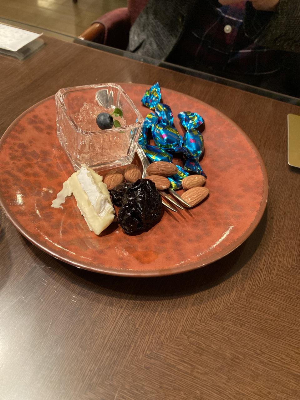 青い包みのチョコレートだけは新しくでてきたかと。アーモンドが中に入ったチョコレート。あとはナッツとかの乾きもの。 -