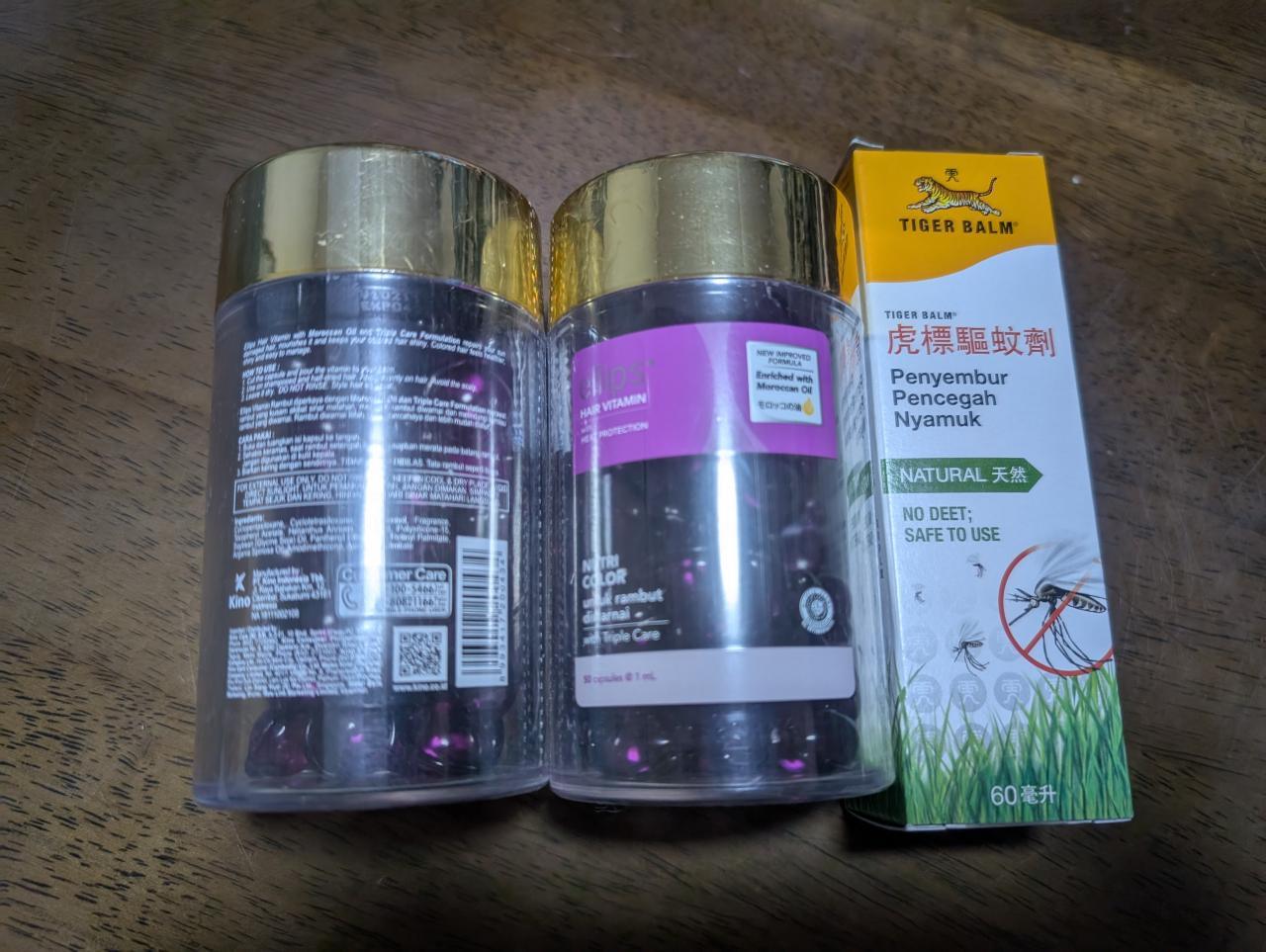 連れはシャツなどを買い私は毎回購入するエリップスのトリートメントとタイガーバームの強力虫よけスプレー。