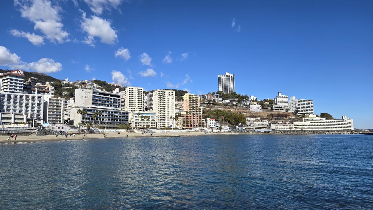 熱海の美しいサンビーチに街並みも綺麗で、新しいホテルも建設中です