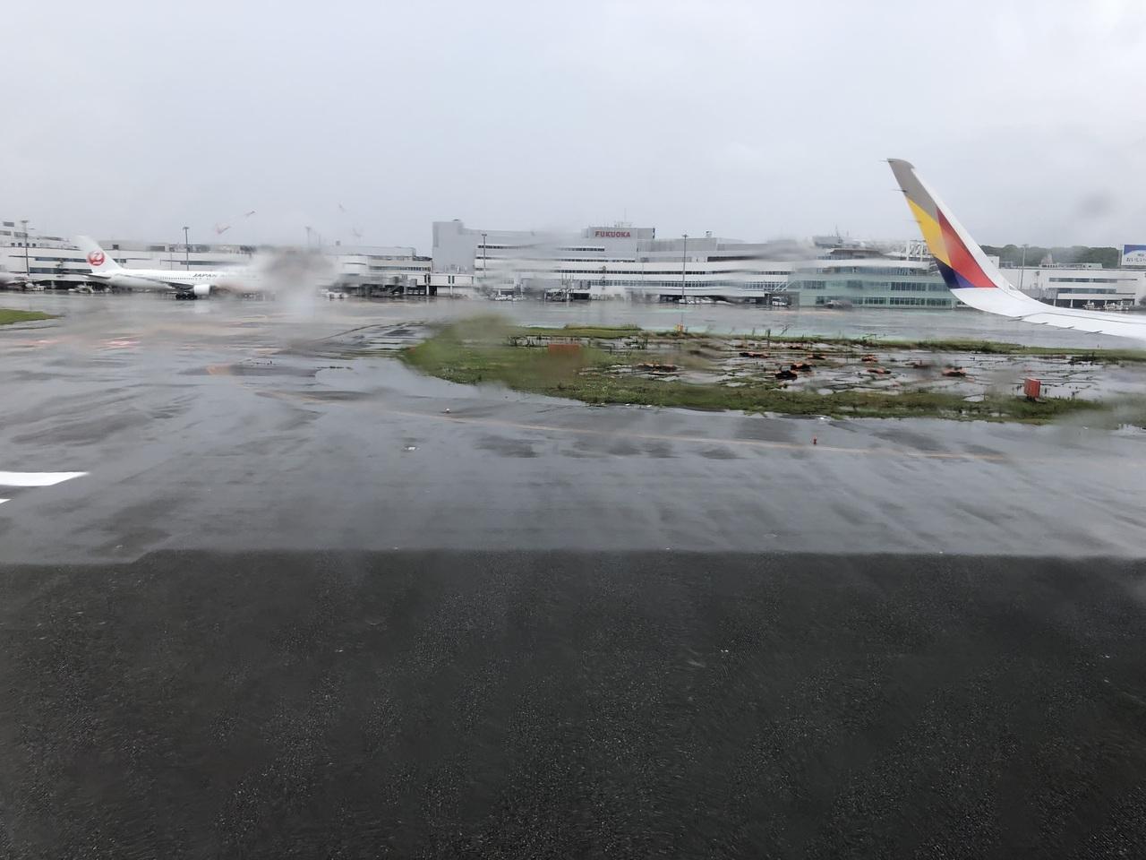 雨が強烈に機体と地面に打ち付けています。で離陸。福岡空港 空港