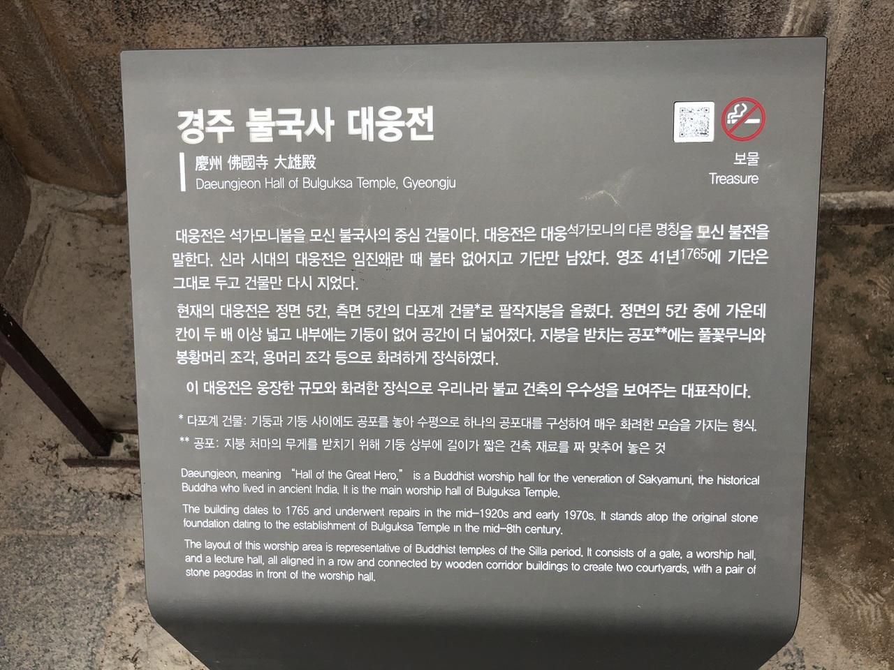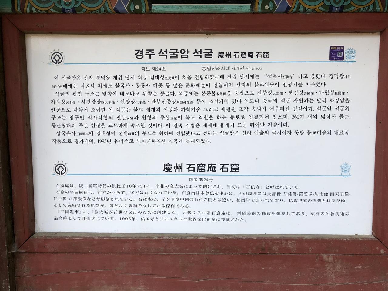 新羅仏教芸術の最高峰の石窟庵石窟の観光案内板。