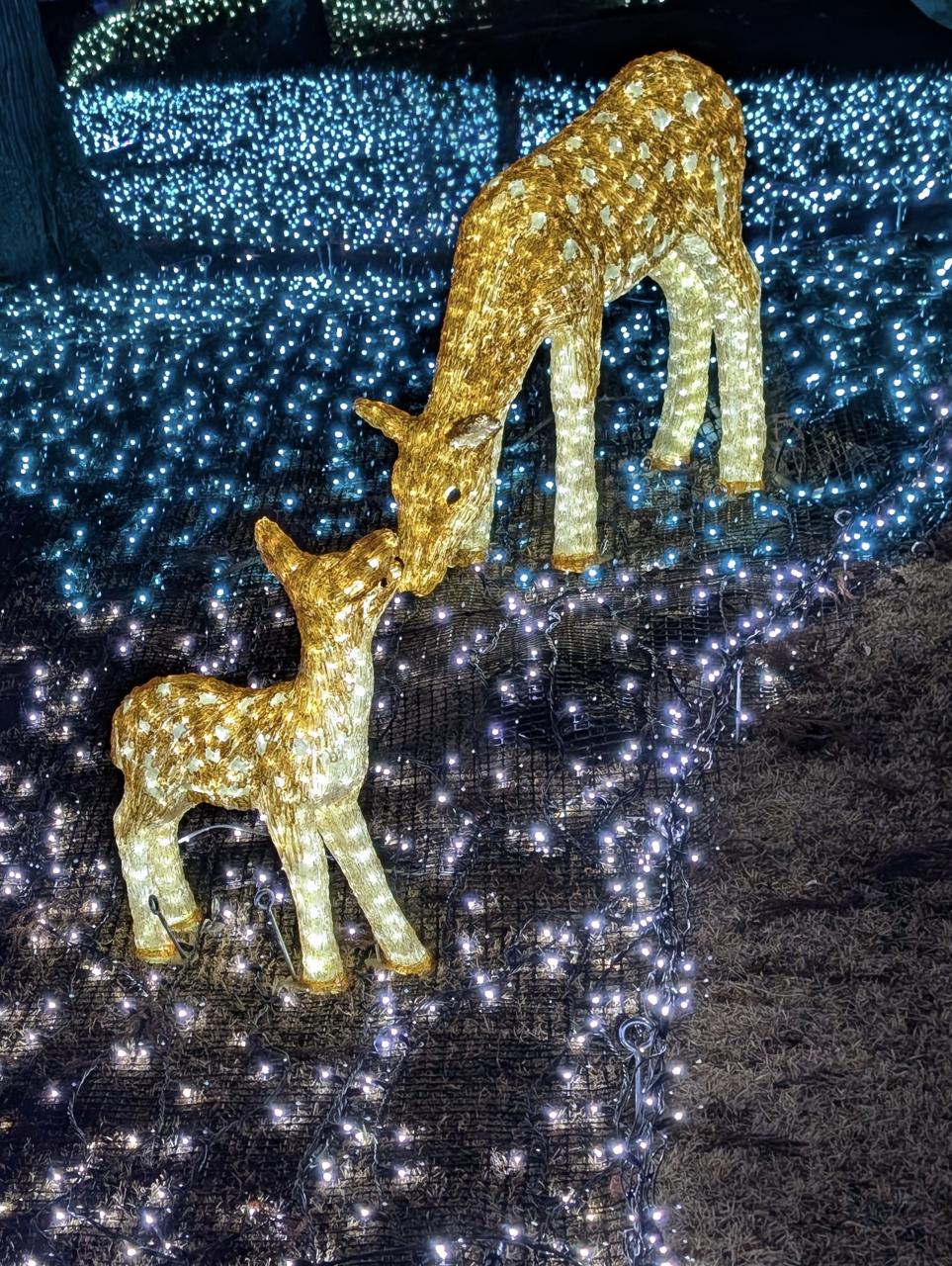奈良春日野国際フォーラム甍 I・RA・KAにやって来た。この場所が〝しあわせ回廊なら瑠璃絵〟のメイン会場となっているようで、出店も出ており人の集まりMaxの場所となっていた。興福寺中金堂の拝観料以外は〝無料〟となっている〝しあわせ回廊なら瑠璃絵〟だが、メイン会場となっているフォーラム甍 I・RA・KAの〝光の庭〟は有料エリアになっている。大人1,000円とはちょっと高いなぁとも感じたが、せっかくここまで来てケチって行かなかったではシャレにならないので、ここは清水の舞台から飛び下りる気持ちで入場料を支払い、館内へと入って行く。入口こそライブ会場のエントランスのようだが、庭に出るとそこには一面ブルーのイルミネーション広場の景色が待っている。青と白のLED照明による〝光の庭〟にライトアップされた木々と鹿・ウリ坊のアクセントが映える様は、入場料を払ってでも見る価値のある立派なものだった。その他電球色LEDに飾られた〝光のアーチ〟、靄がかかる渓谷をイメージし様々な色にライトアップされた木々に加えて光の絨毯とくれば、客寄せのために電球数だけを増やしただけの高額な入場料を取る施設のイルミネーションイベントとは比較にならない位に手が込んでいるものだと自信を持って言うことができる。勿論しぜん回廊なら瑠璃絵の〝メイン会場〟でもあるために、会場内の混雑は避けられないが、写真を撮るため場所の空き待ちの時間を考えてもその価値は十分にあると感じた。まぁ人が多い分だけ長居をすることは出来ないが、人の流れに合わせて滞在した僅かな時間でも充分楽しめたひと時であった。