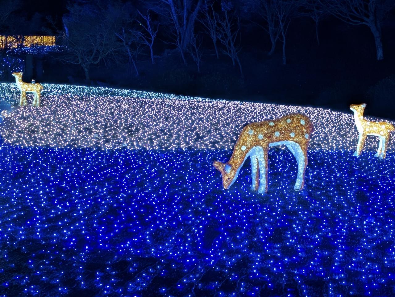 そんな感じで奈良春日野国際フォーラム甍 I・RA・KAの光の庭を満喫して館外へと出る。会場に於ける出入口は異なった場所となっており、人が少しでも滞留しないように配慮されているようだ。出口には椿の花があり、あまりライトアップされる対象にならないもののようにも思うのだが、ブルーの照明で浮かび上がらせると意外にも映えるものだと感じた。その後は東大寺に向かって歩いて行く。途中には一番最初に見かけたものやブルーのツリーをモチーフとしたイルミネーションが飾られており、イベント期間以外であれば結構暗いのではないかと思える公園内通路の“街灯”の役目を果たしているようにも見えた。