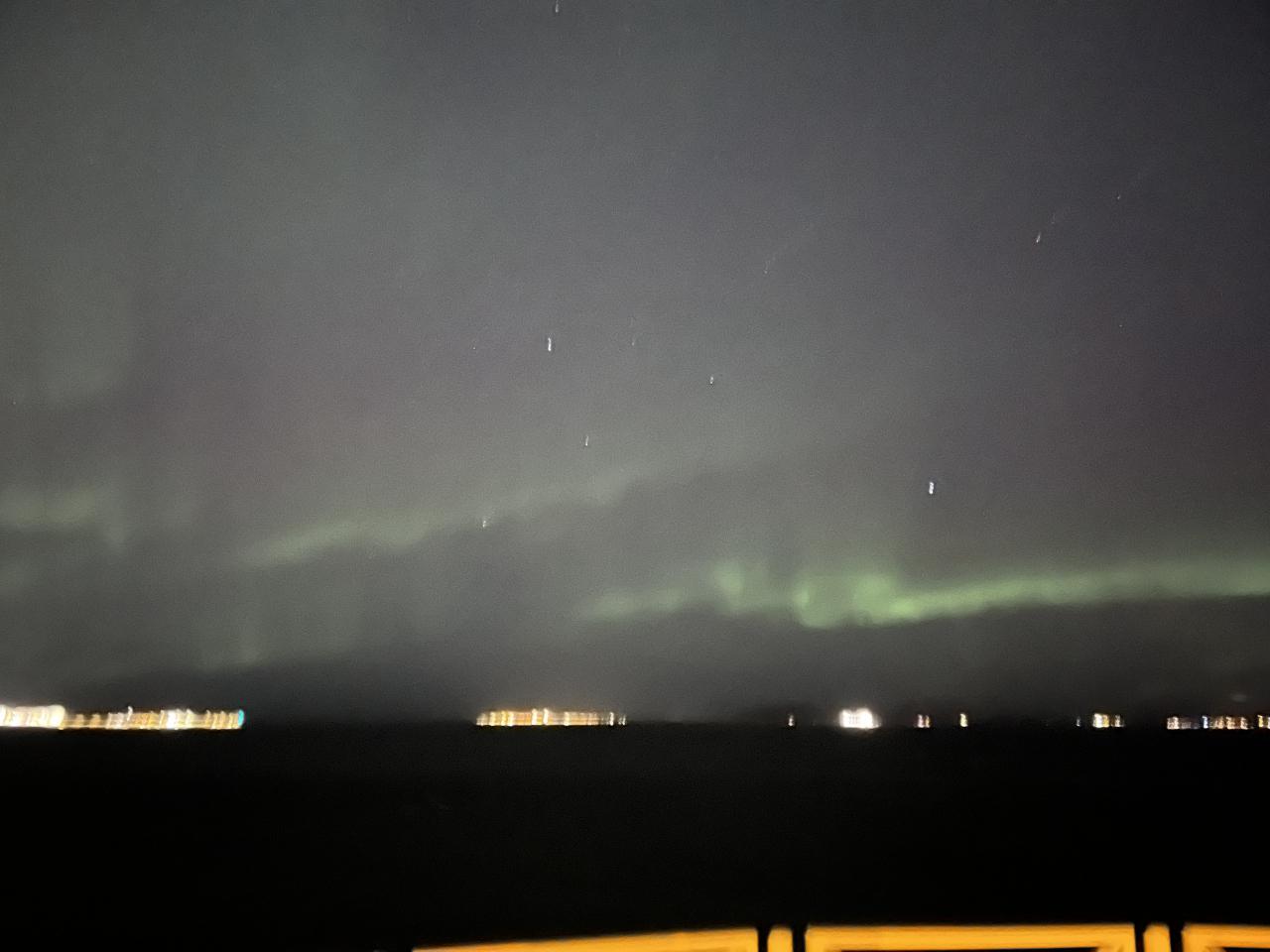 レイキャビクは北に海が広がっていますので、街中からもこうやって開けたところがあり、タイミング合えばこのようにオーロラが見えます。 -