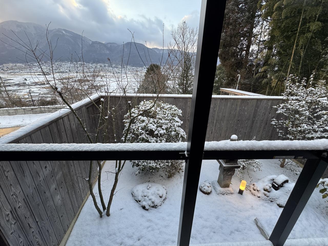 食後は部屋でのんびりしていましたが、夜になって雪が降ってきました。前述の通り私は楽観的でしたが、