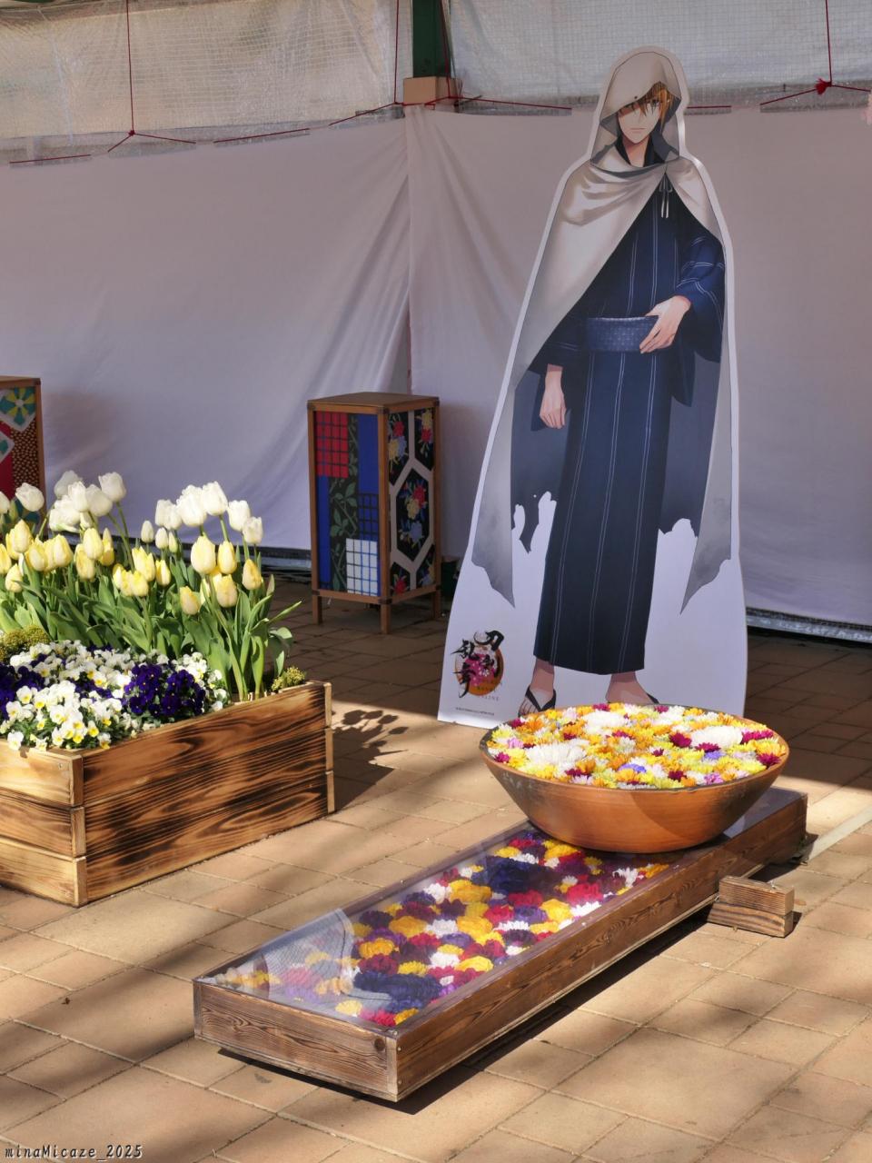 写真右(画面の外)にレストラン、左奥がフードテラス、そして、中央の奥、横長の屋根が架かっているところに「刀剣男子パネルと、花手水」が置かれています。