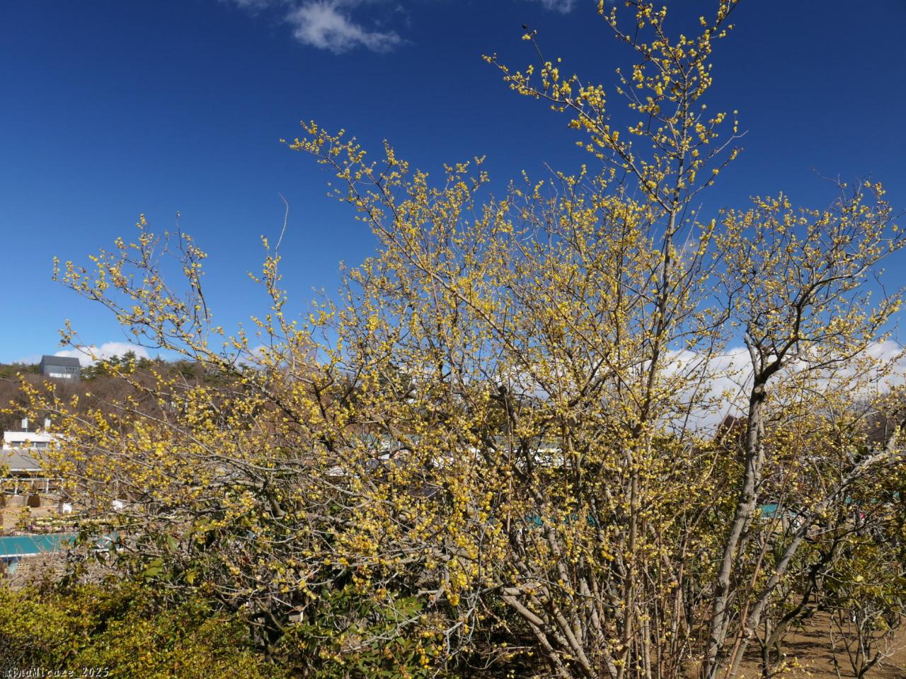 青い空と白い雲、山の上には「栗田美術館」、ロウバイが綺麗ですね。