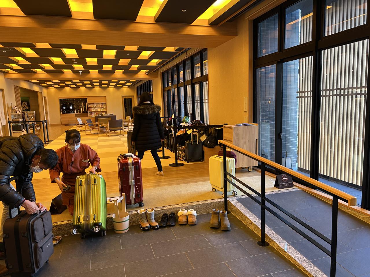 当然まだチェックインは出来ずスーツケース2個を預かって頂きますが、全館土足厳禁なので係りの方がキャスターを掃除します。海外から来ていますので大きなスーツケースで申し訳ございません。天然温泉 加賀の宝泉 御宿 野乃金沢 宿・ホテル