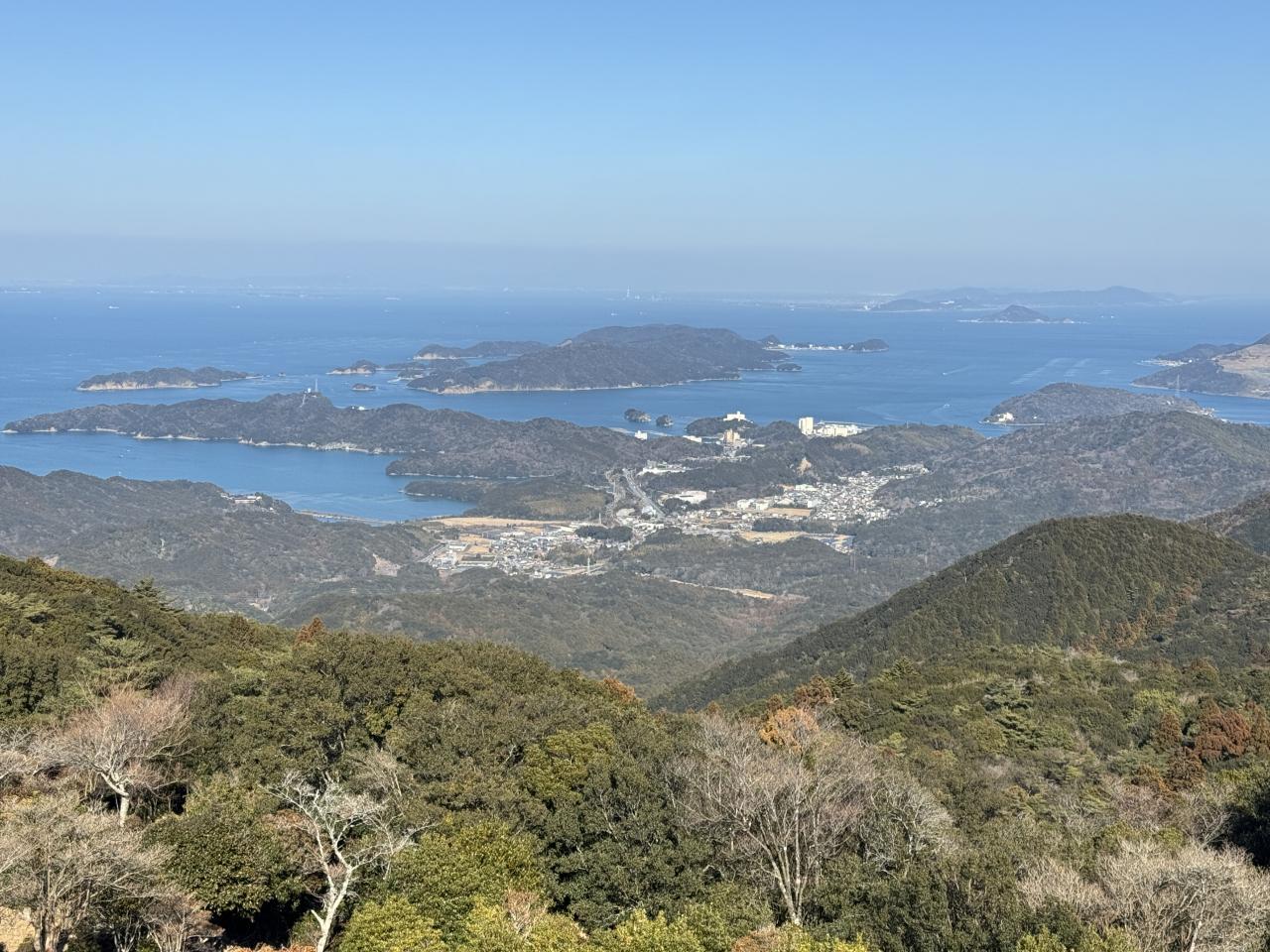 本丸跡からの眺め。近鉄線と真珠島へ渡る橋が見える。
