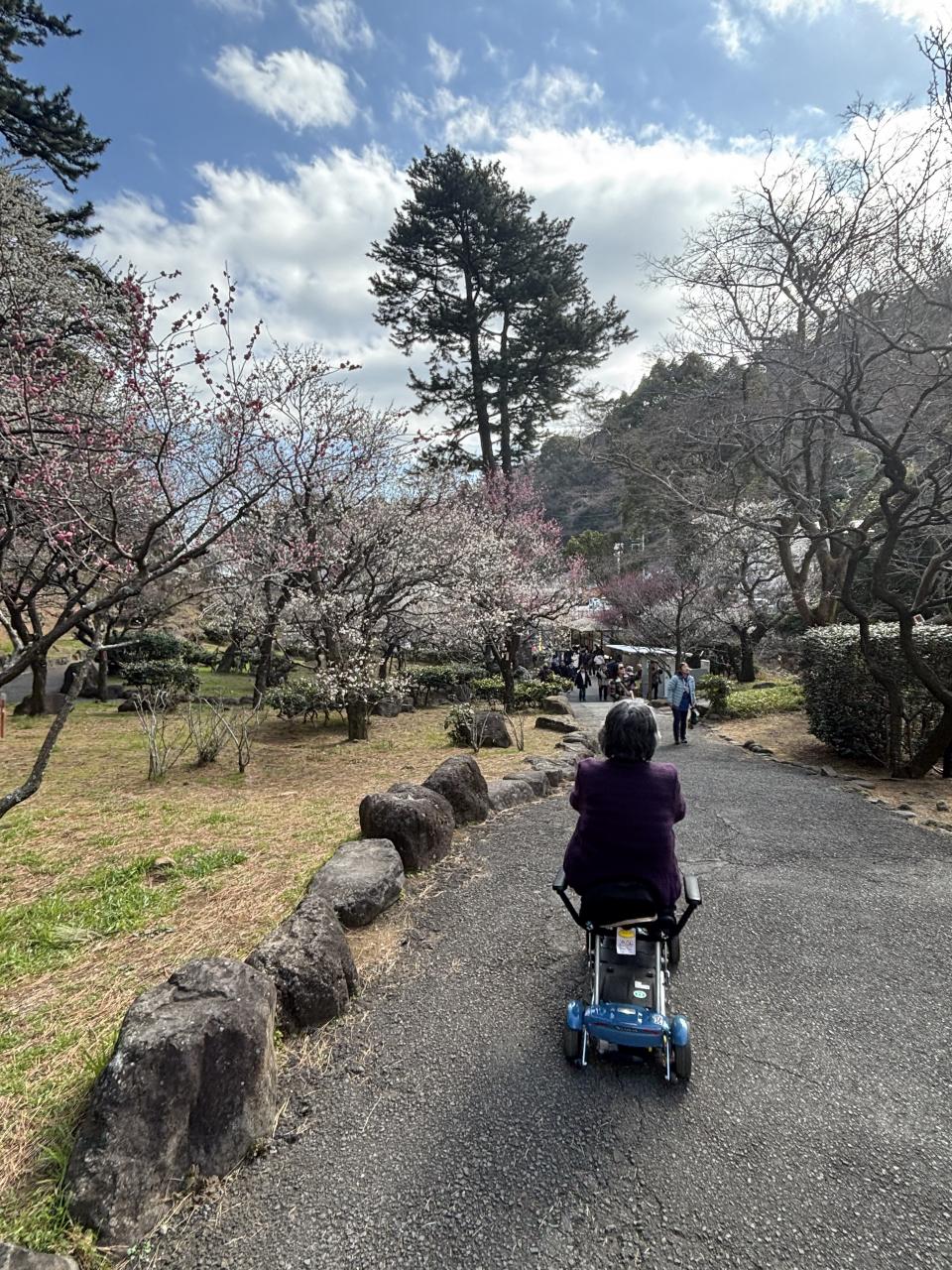 梅の花の中を快適に電動カートを運転する90歳の母。