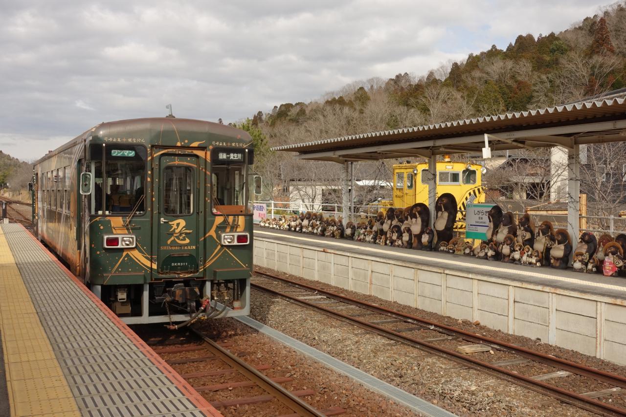 柘植で草津線に乗り換えて貴生川へ進み、ここから信楽高原鐡道に乗車。貴生川駅のある甲賀市は伊賀と並ぶ忍者の里、ということで忍者ラッピングの車両がある。