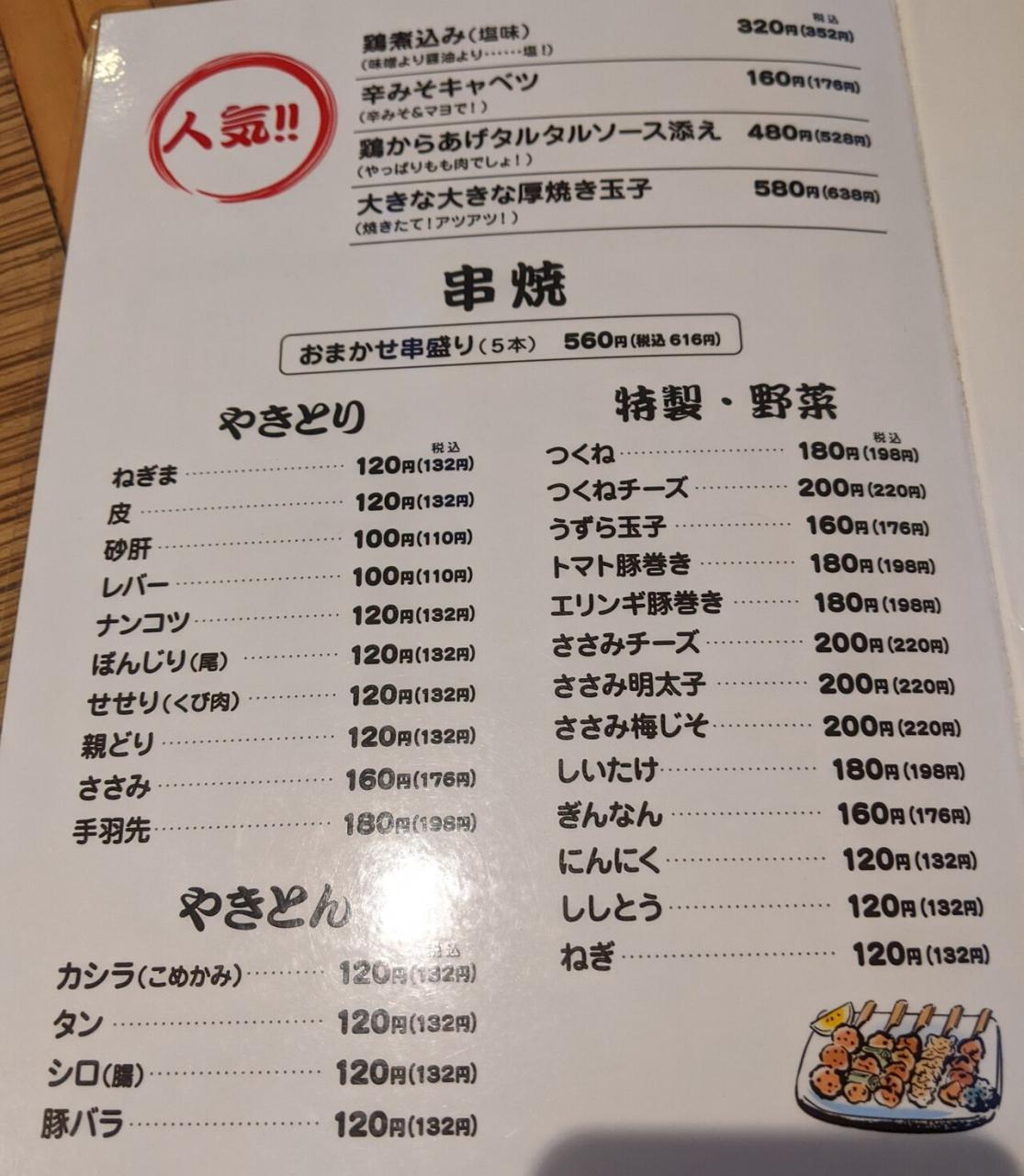 焼き鳥メニュー、辛味噌キャベツが安い!