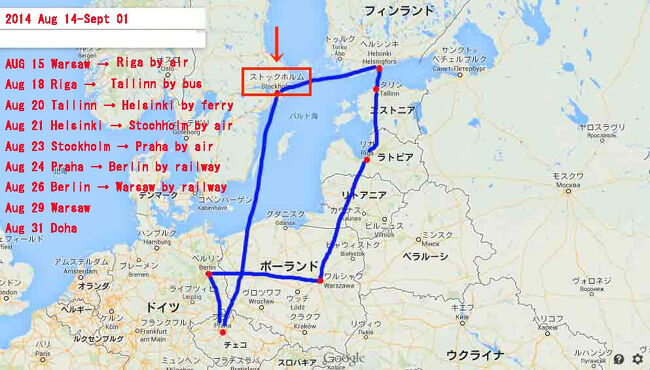 2014年8月に、一人旅で数カ国を訪れた。航空券が安かったので、カタール航空でドーハを経由して、ポーランド、ワルシャワに到着。以降リーガ(ラトビア)、タリン(エストニア)、ヘルシンキ(フィンランド)、ストックホルム(スウェーデン)、プラハ(チェコ)、ベルリン(ドイツ、再びワルシャワに戻り、カタール航空(ドーハ経由)で帰国した。