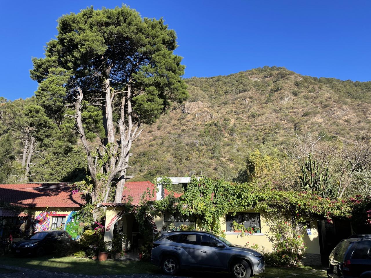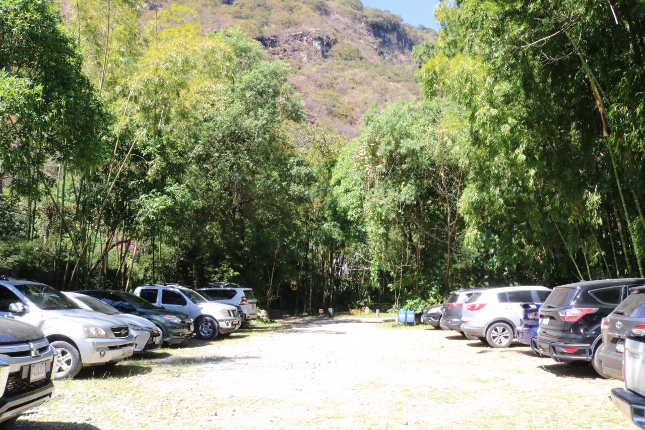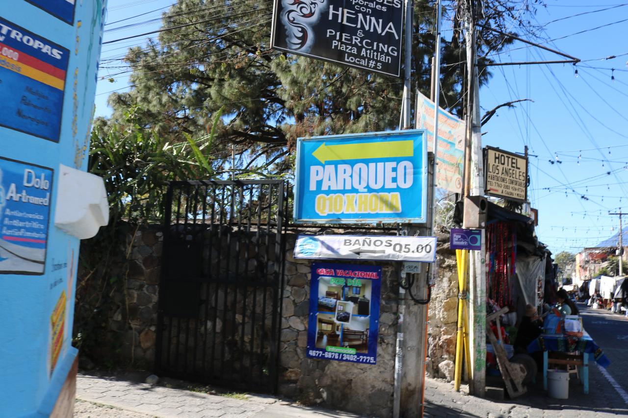 ホテルAtitlánの少し先に、大きな駐車場があります。