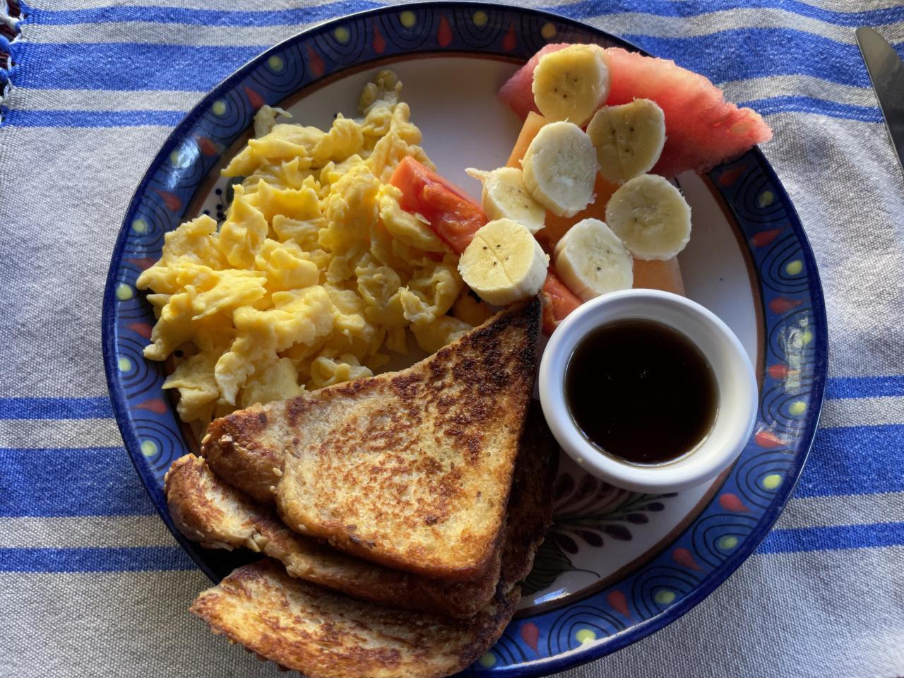 旦那さんはフレンチトースト(メープルシロップ付き)、スクランブルエッグ、フルーツの盛り合わせ。