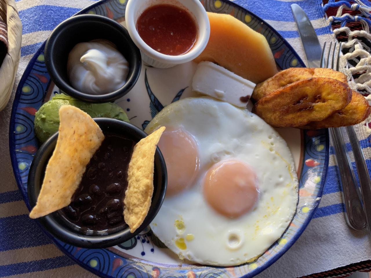 目玉焼き、豆、チップス、揚げたバナナ、メロン、アボカド。マヨネーズや辛いソースをつけていただきます。