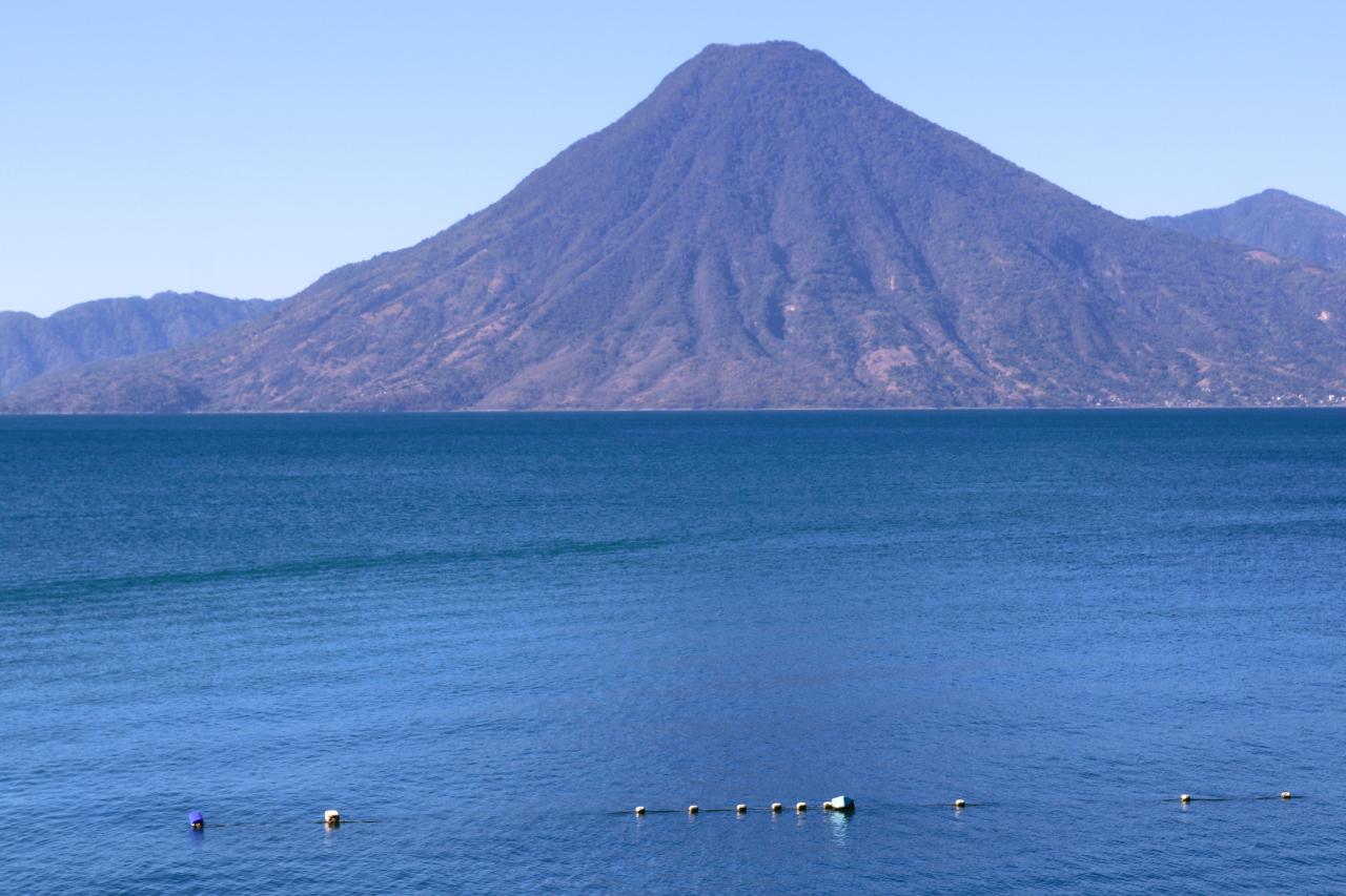 アティトラン火山(3,535m)、その右手前がトリマン火山(3,158m)、右にサン・ペドロ火山(3,020m)。 -