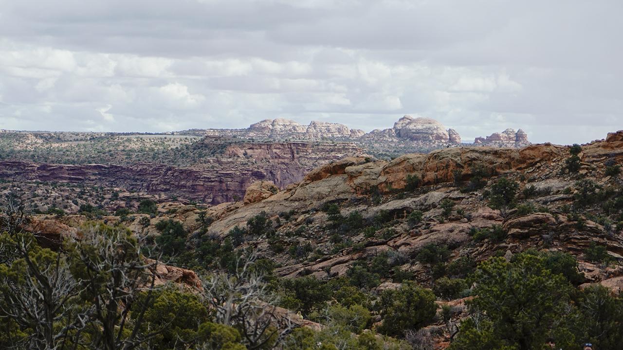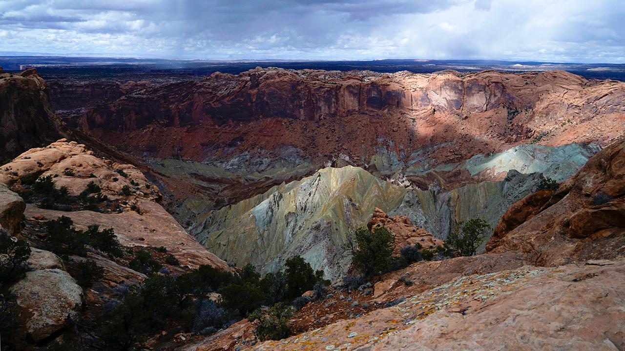 ここからは、コロラド川とグリーン川が合流する地点のエリアを見渡すことができる。広がっているのはホワイトリム層の大地。そしてさらに下には、浸食が進んだ大きな窪地がある。この窪地は「モニュメント・ベイスン(Monument Basin)」というそうだ。 -
