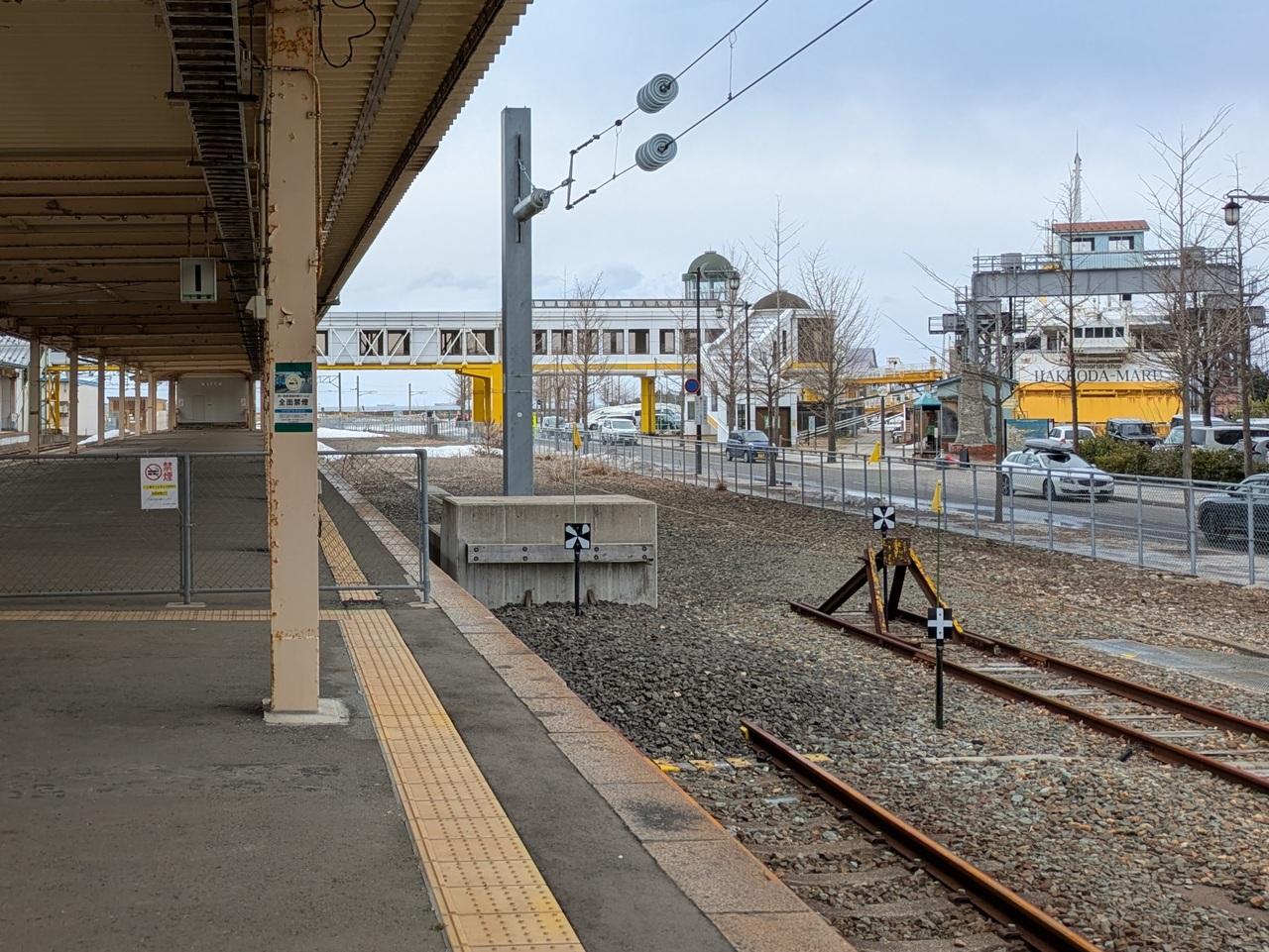 ここで線路は終わり。かつては、右に見える黄色いラインの青函連絡船へ乗り継げる順路がここから先へと存在していた、らしい。