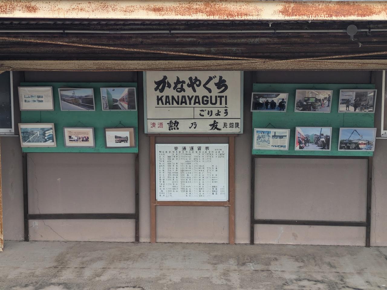 その横奥には金屋口駅の駅名表示と駅舎が残されていました