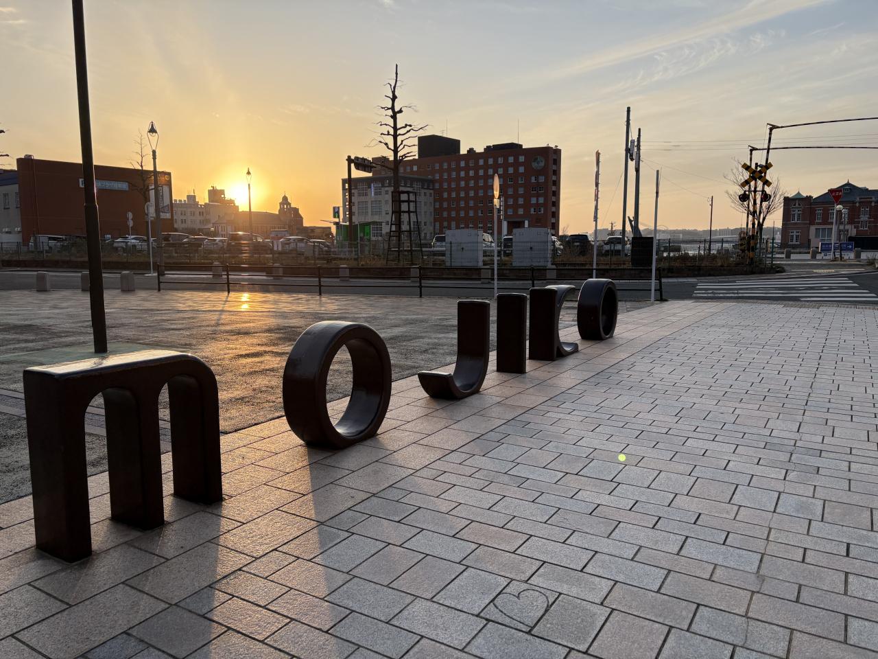 2度目に通り掛かったmojikoモニュメント。今度は夕陽が長い影を引いています。