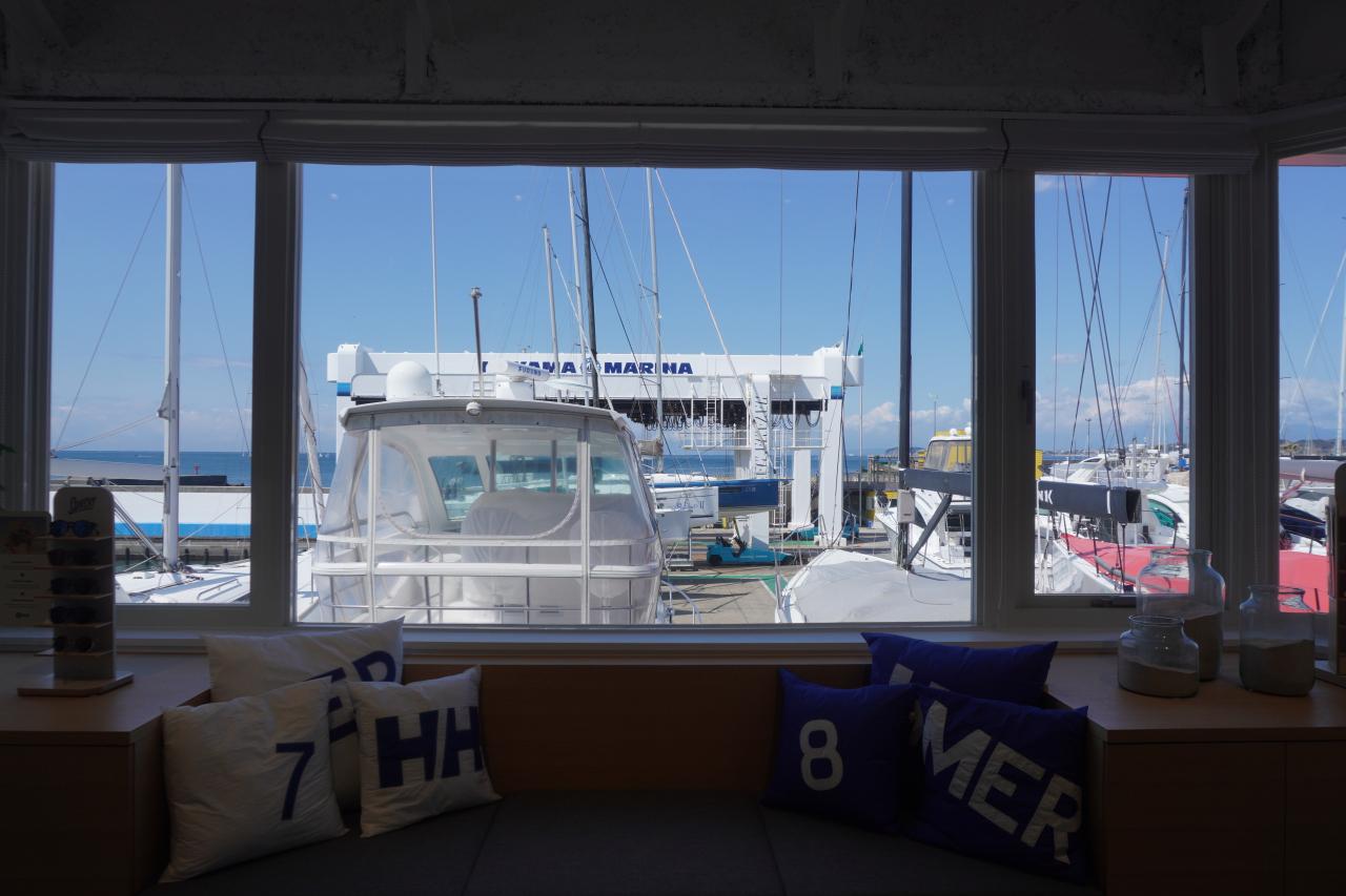 中に入ると奥のガラス窓から葉山マリーナに係留中のヨット群がすぐ目の前に見えていて、かなり壮観。ここが葉山の総本山といった光景です。