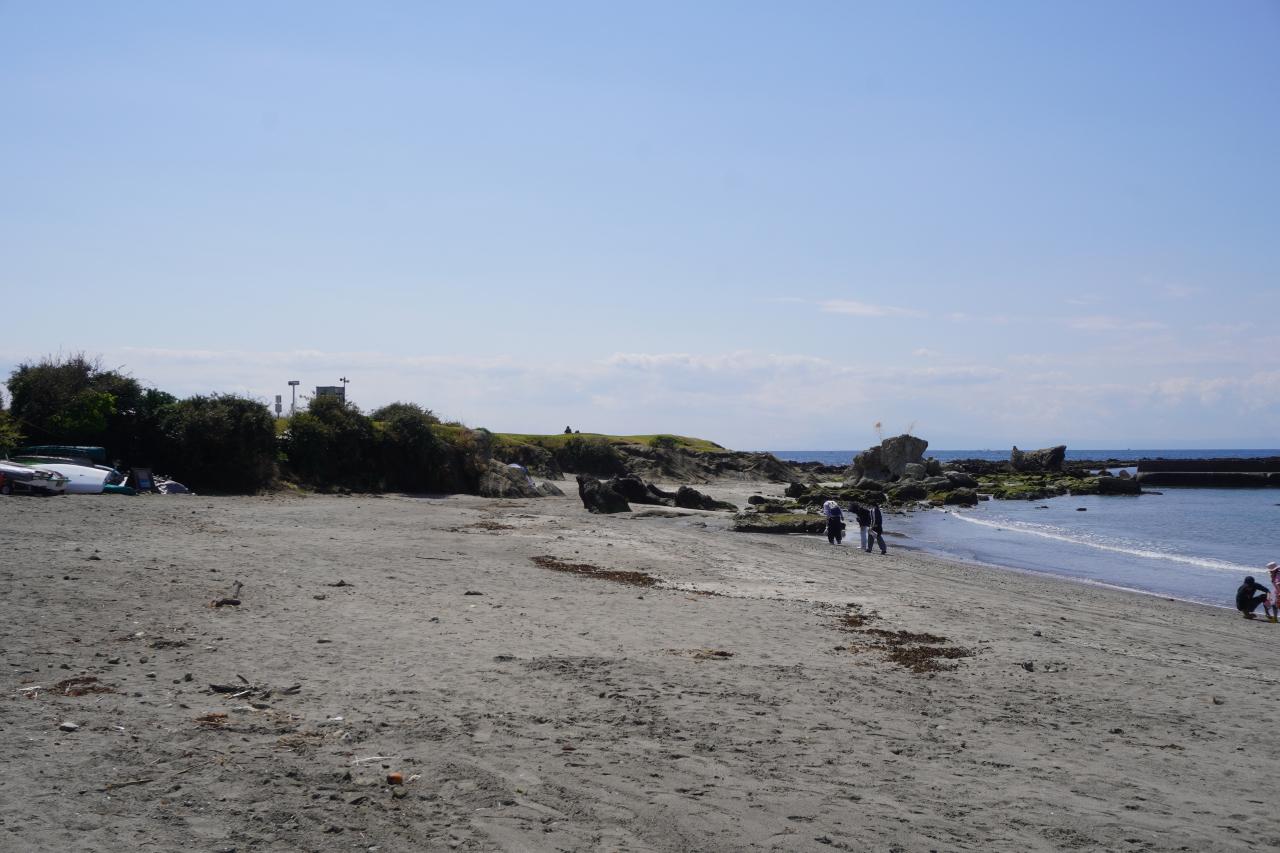 森戸神社の南側の真名瀬海岸。緩やかな弧になった砂浜の海岸です。
